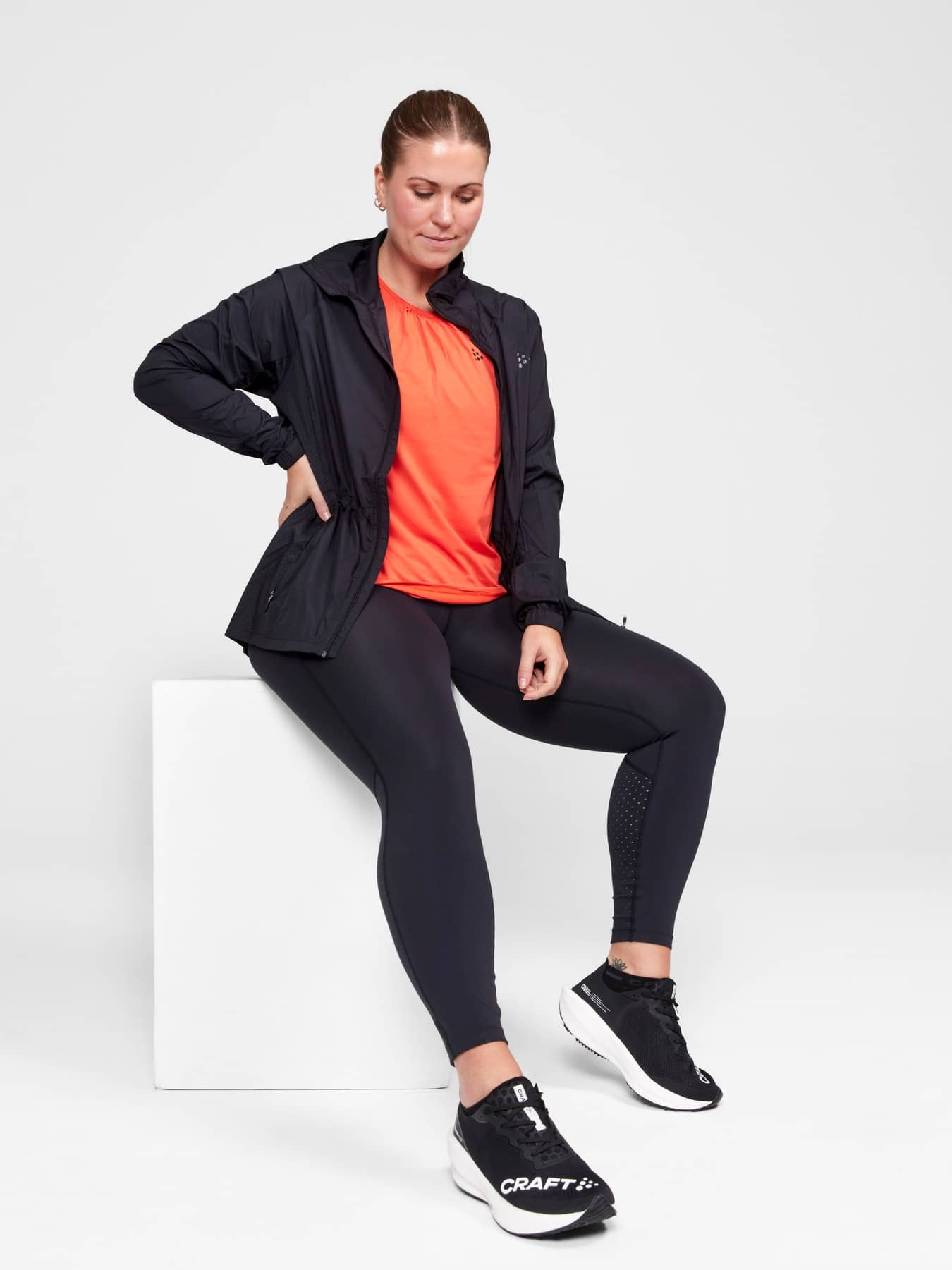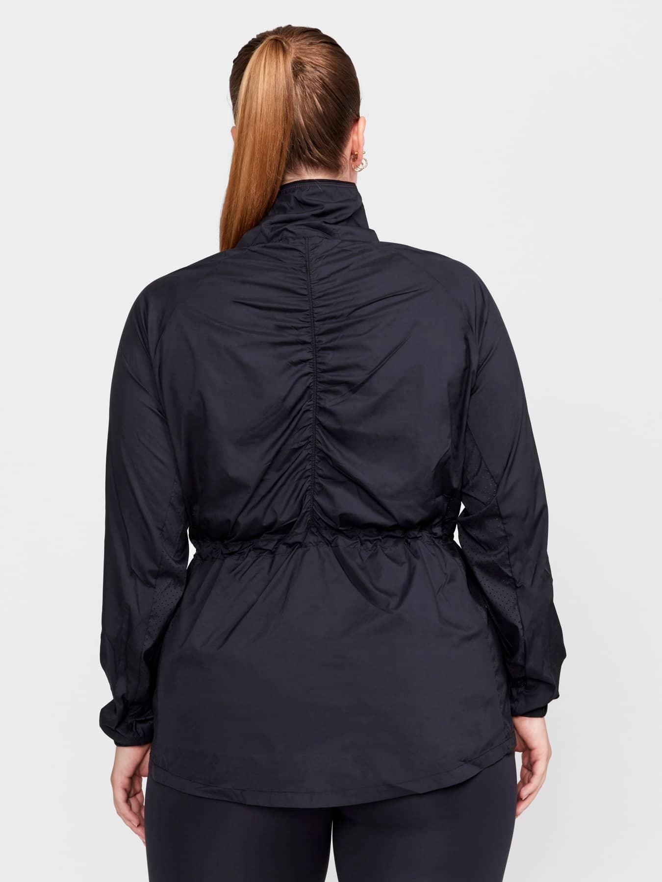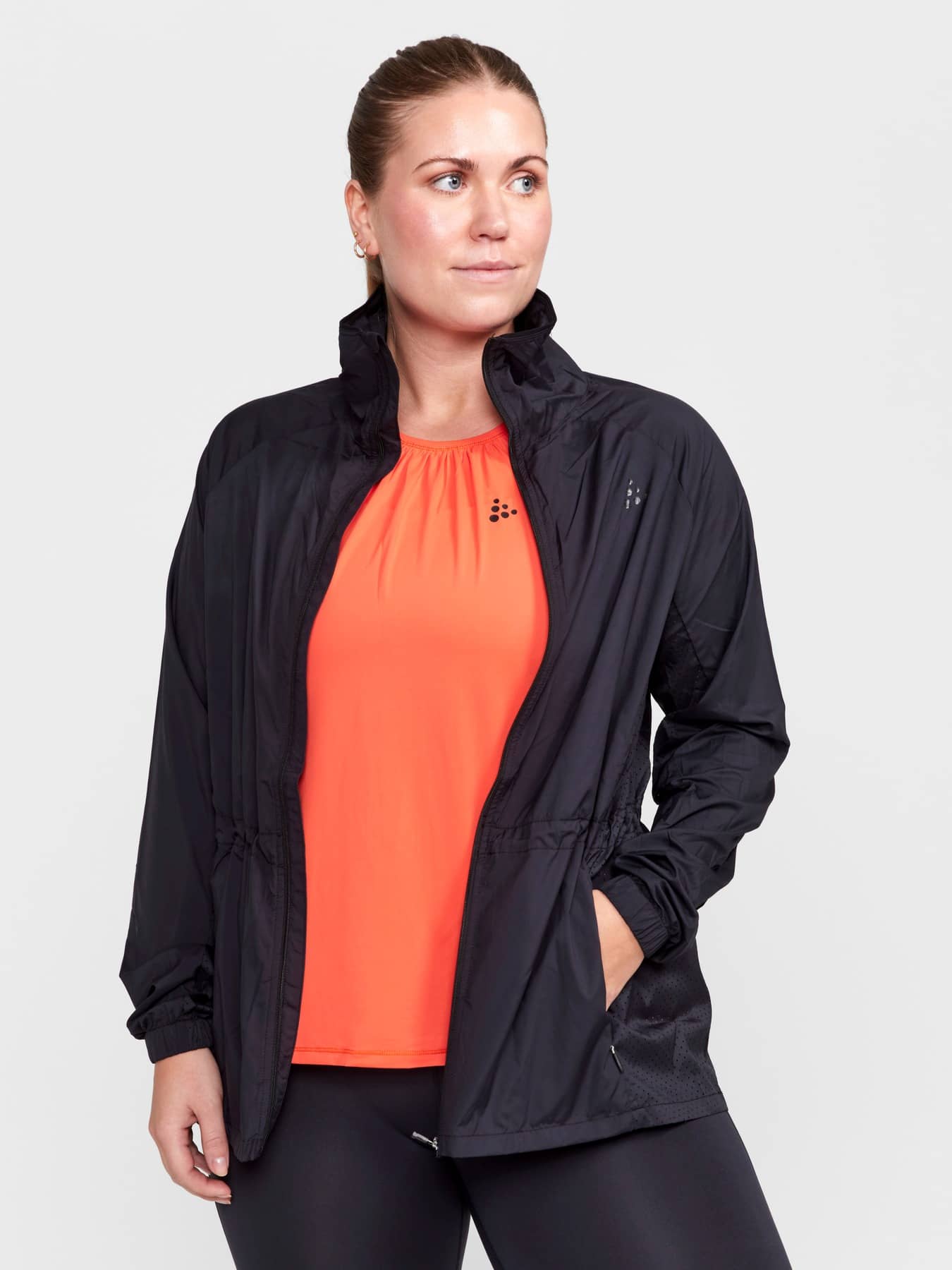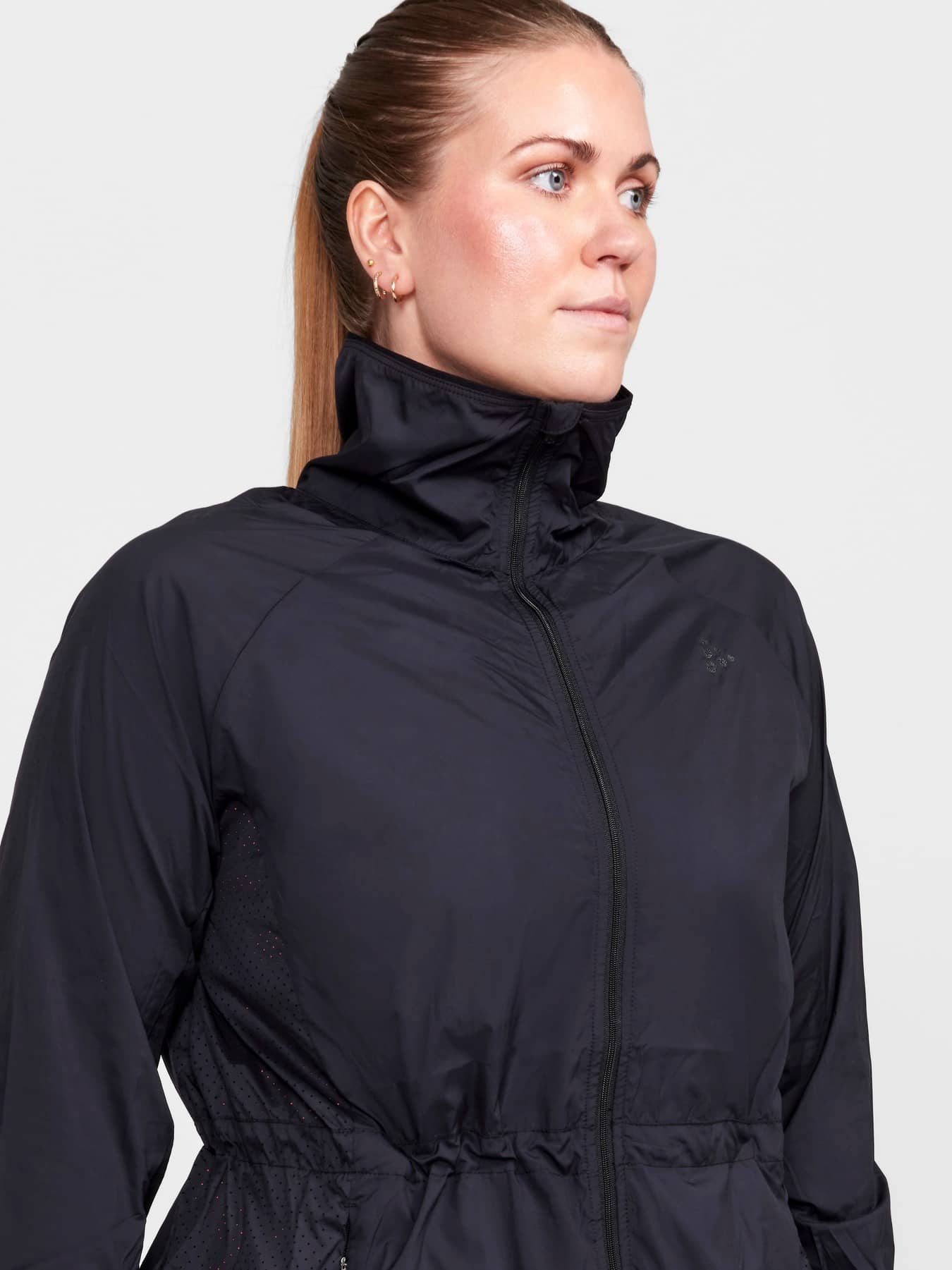 Versatile training jacket with adjustable drawstring at waist for a feminine fit. Made of lightweight, woven wind- and water-repellent recycled polyester offering efficient moisture transport. Perforations for enhanced ventilation. Two zip side pockets.