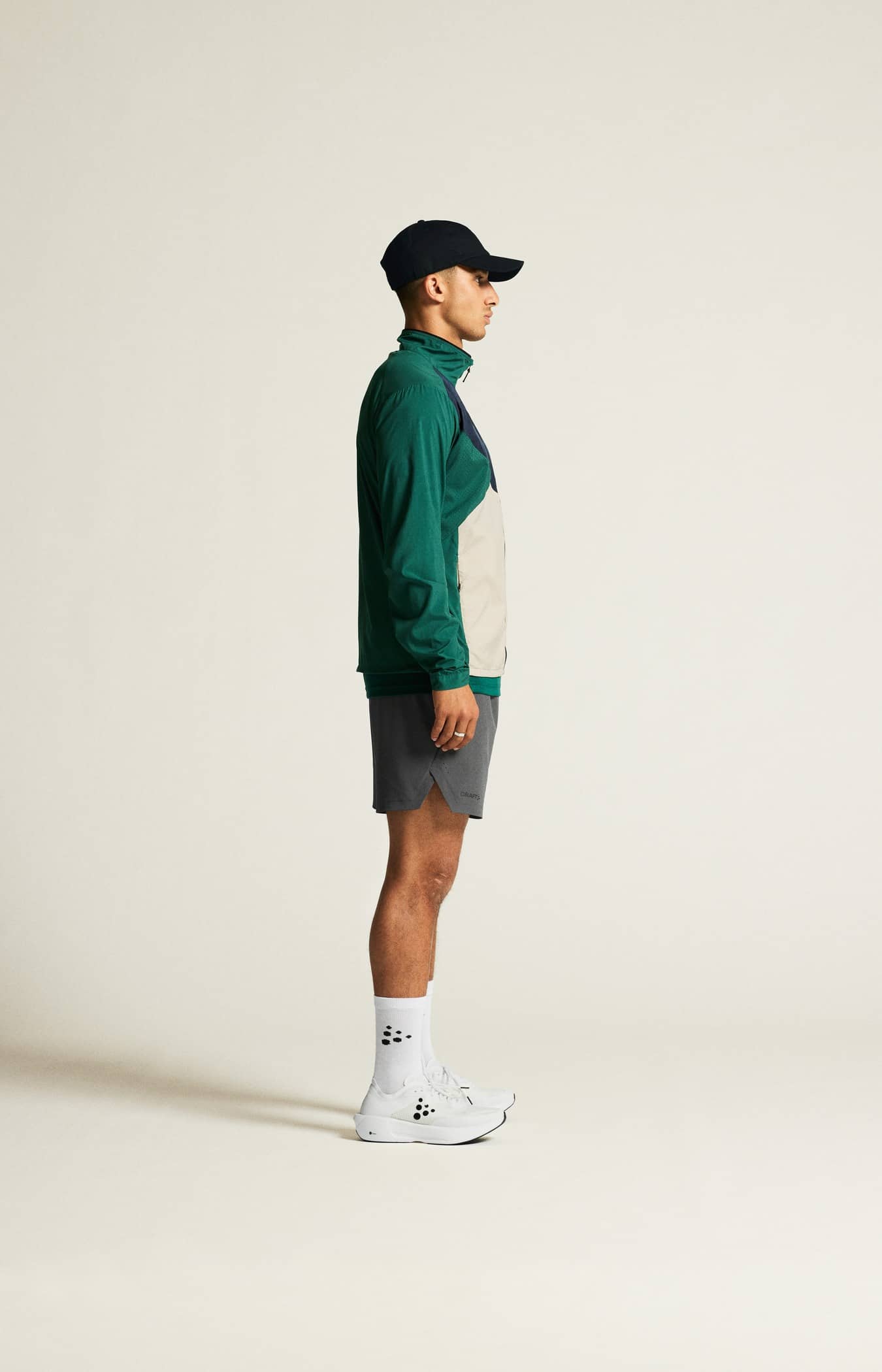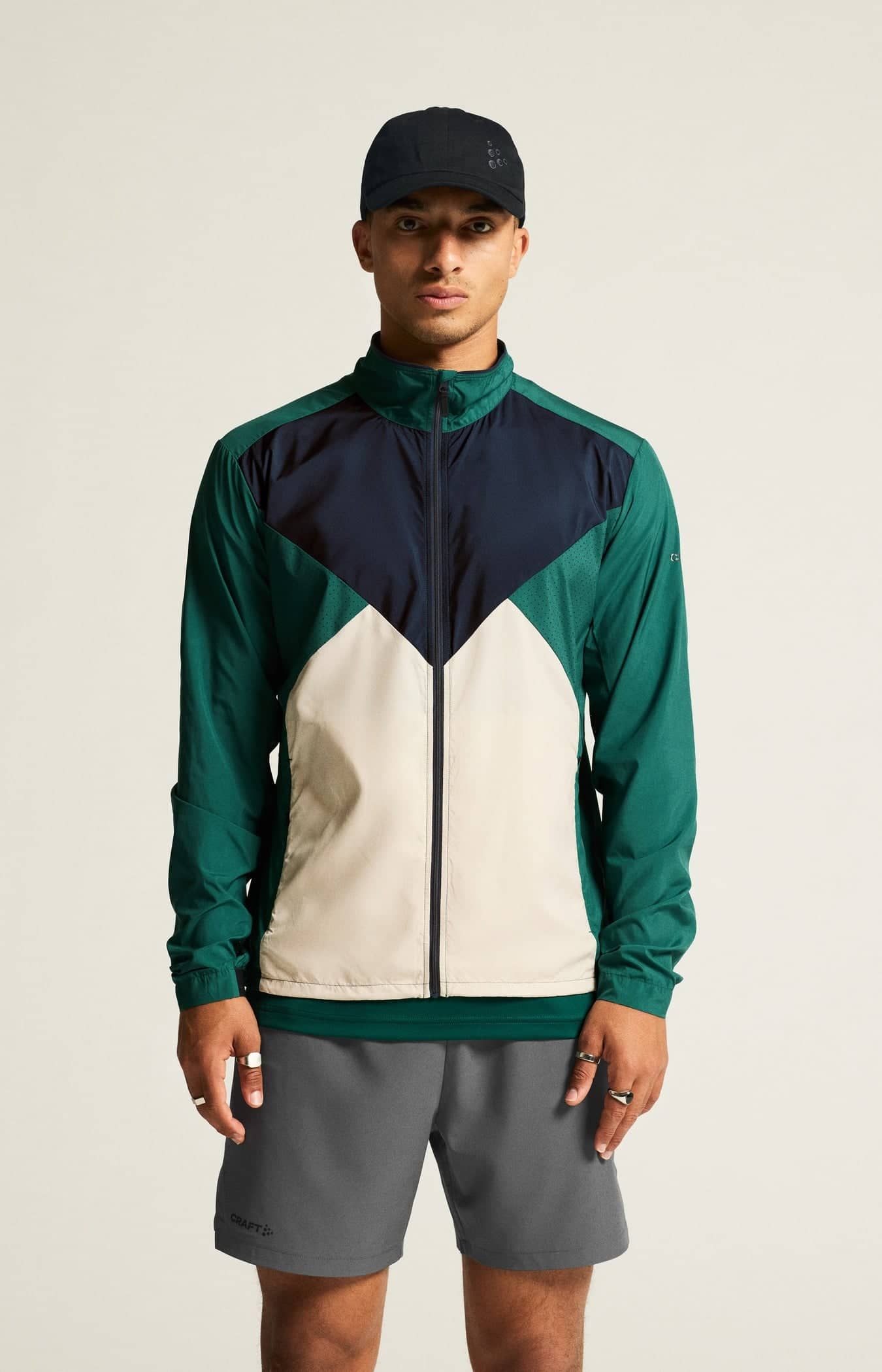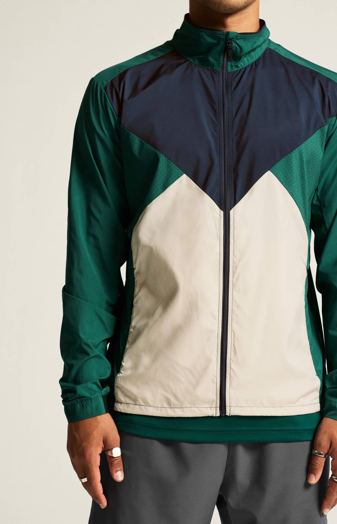Wind- und wasserabweisende Jacke für intensives Training. Hergestellt aus recyceltem Polyester, mit Perforationen im Brustbereich und unter den Ärmeln für eine verbesserte Belüftung.