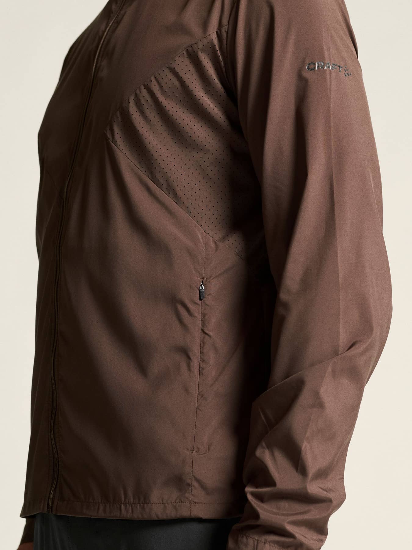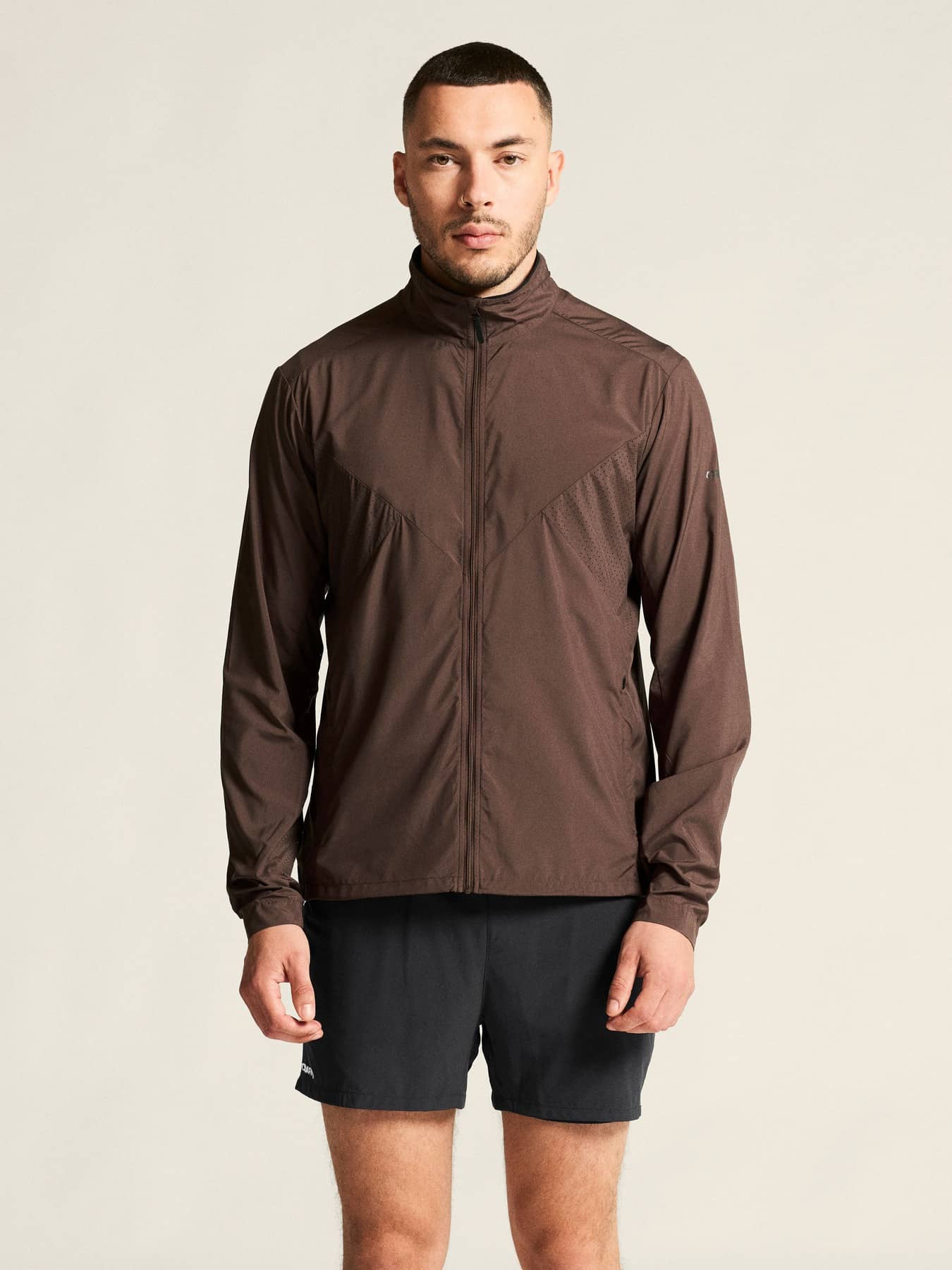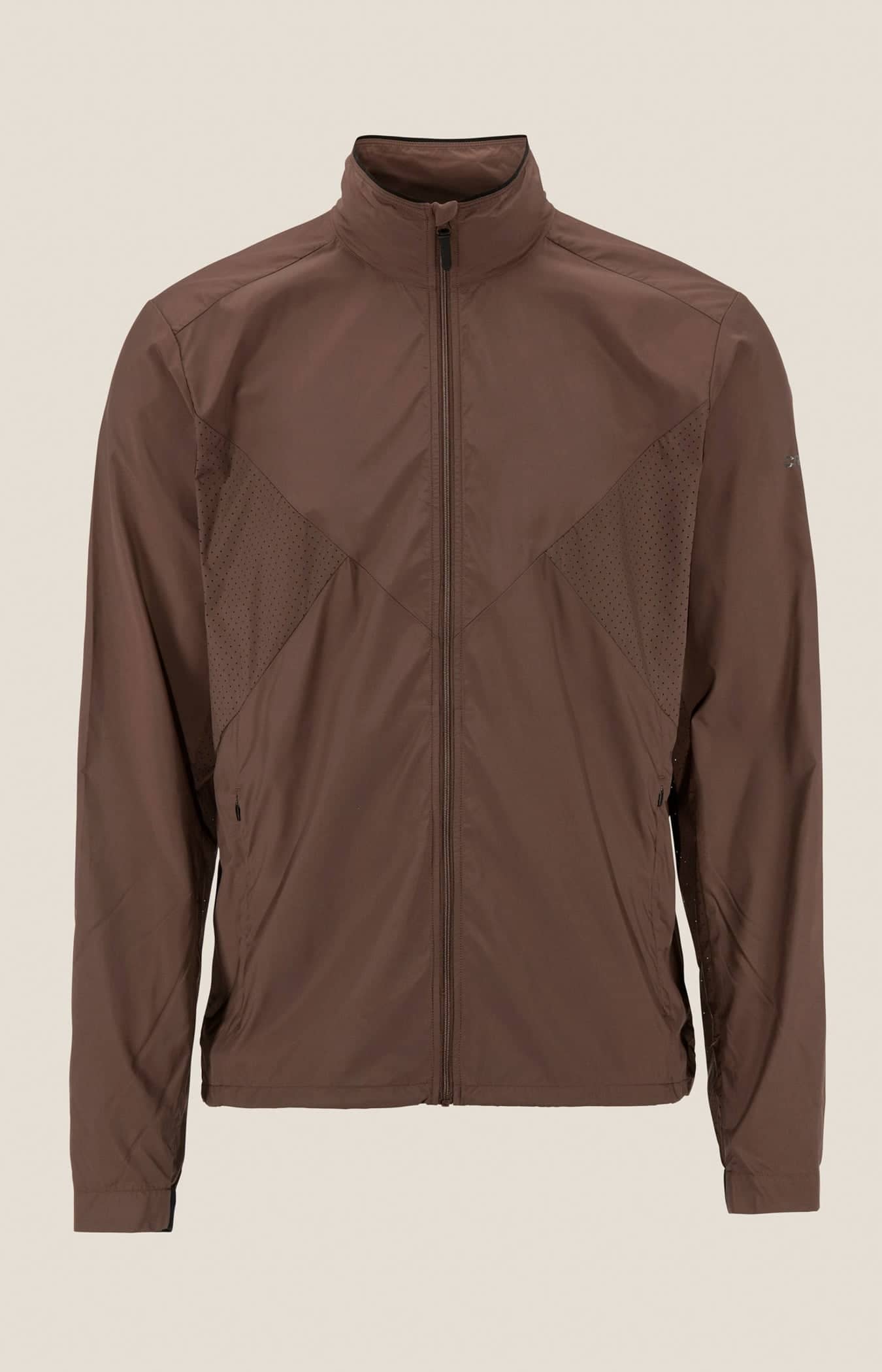 Wind- und wasserabweisende Jacke für intensives Training. Hergestellt aus recyceltem Polyester, mit Perforationen im Brustbereich und unter den Ärmeln für eine verbesserte Belüftung.