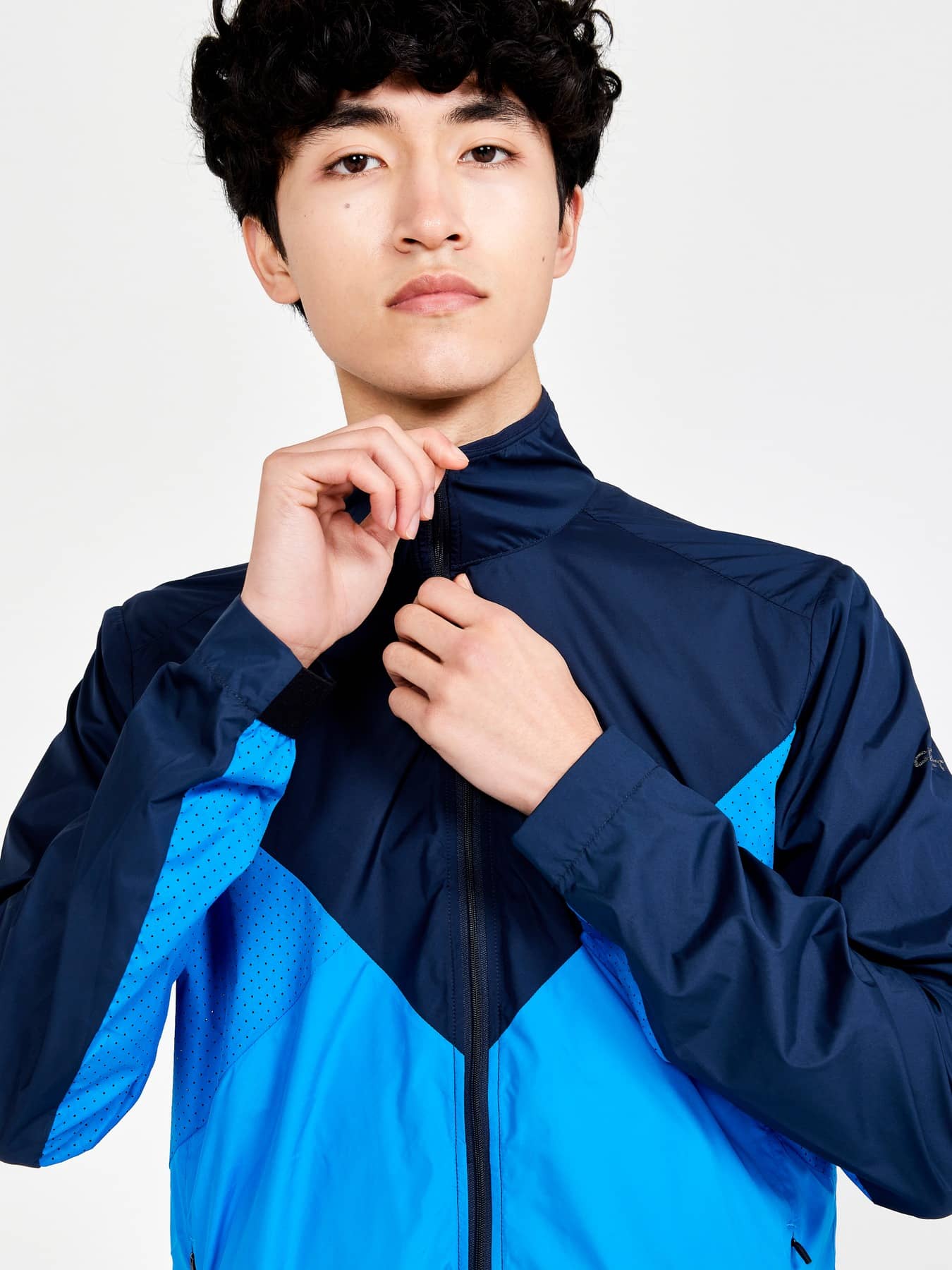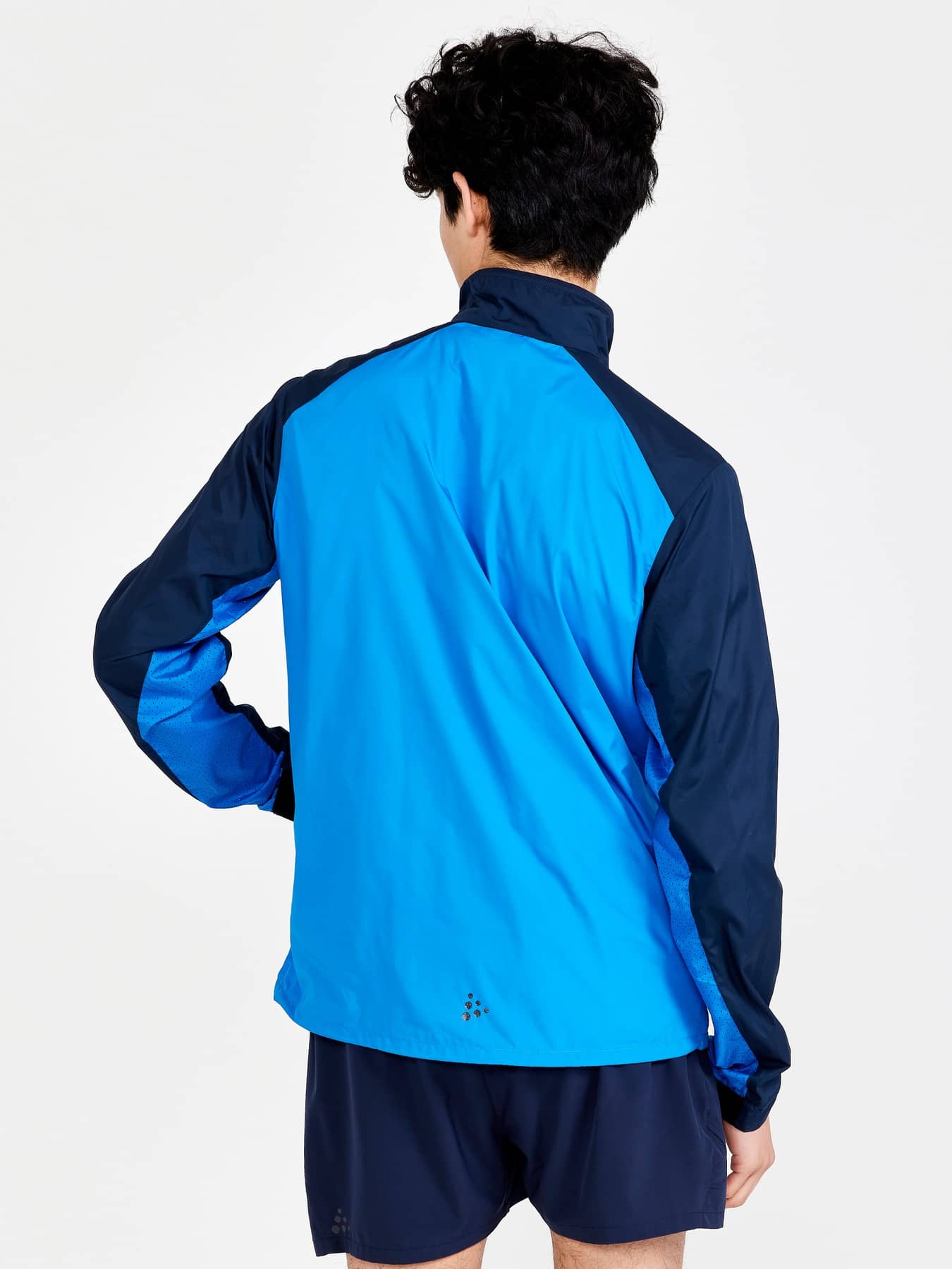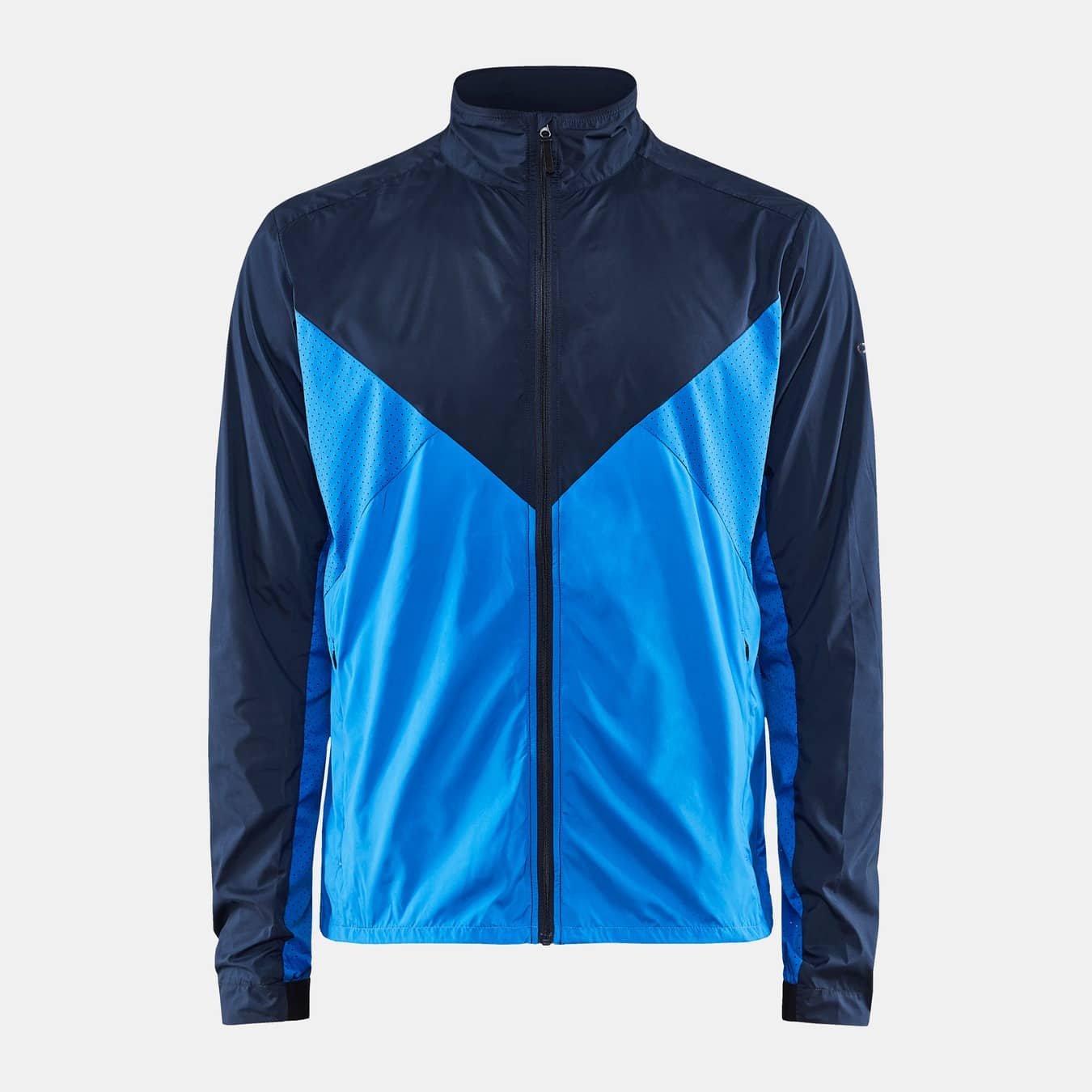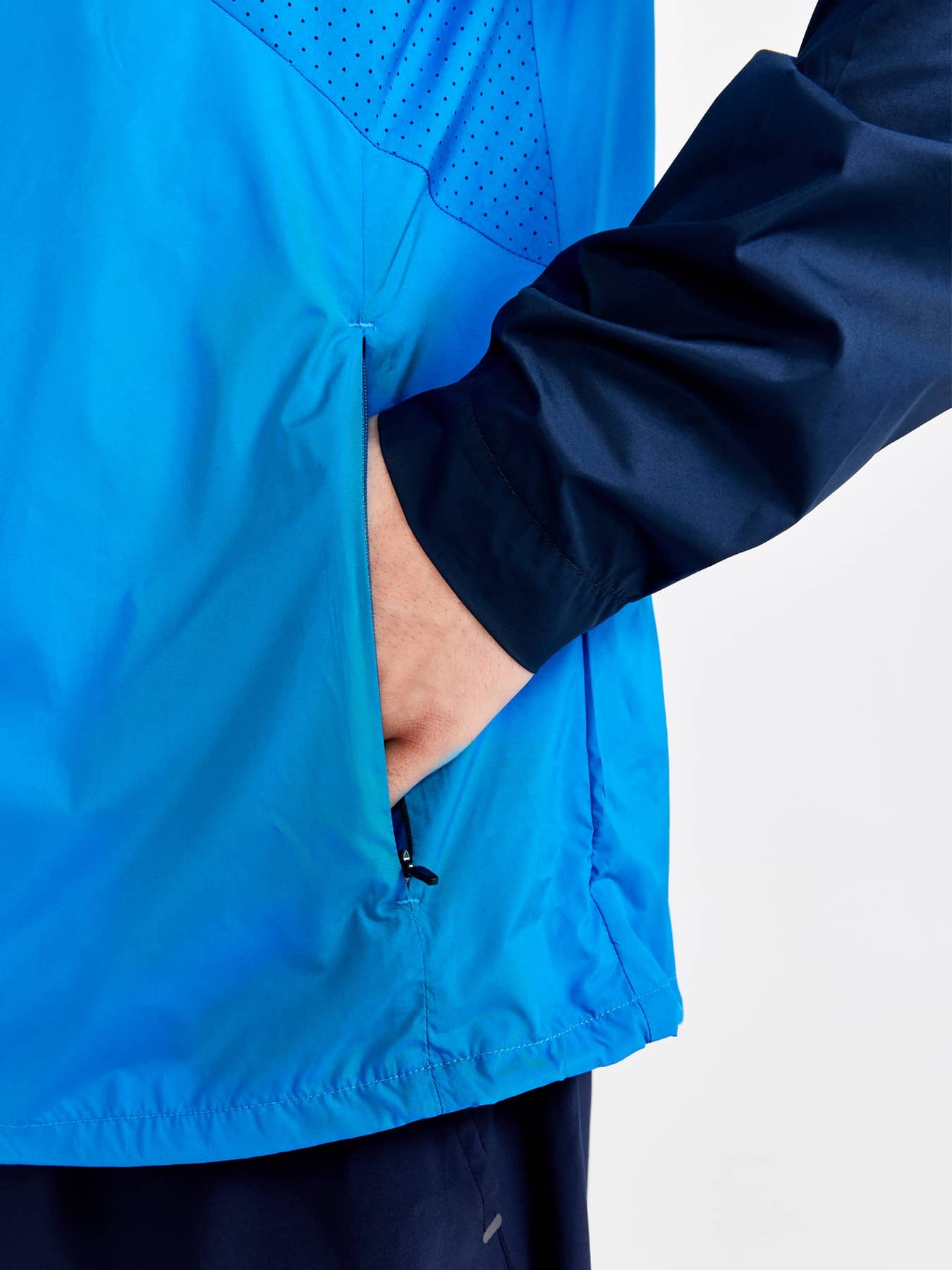 Wind- und wasserabweisende Jacke für intensives Training. Hergestellt aus recyceltem Polyester, mit Perforationen im Brustbereich und unter den Ärmeln für eine verbesserte Belüftung.