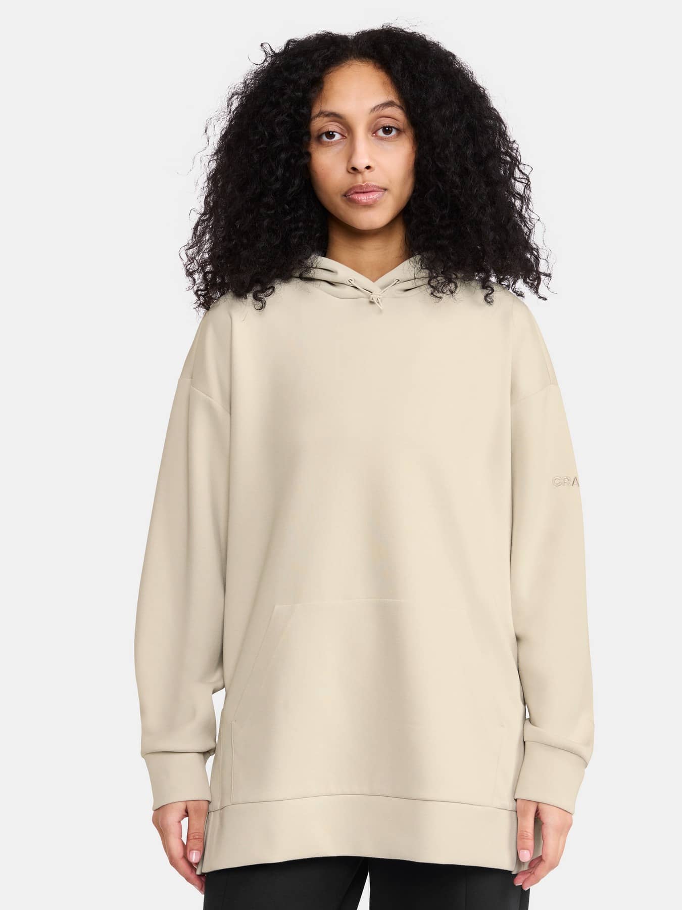 Dieser bequeme und stilvolle Kapuzenpullover besteht aus einem hochwertigen Stoff mit glatter Baumwolle außen und weichem Polyester innen. Das Ergebnis ist ein äußerst bequemes Teil, das sowohl bei lässigen Alltagsaktivitäten als auch auf dem Weg zum und vom Fitness- oder Yogastudio glänzt. Der Kapuzenpullover ist leicht übergroß und hat eine lange Passform und fallende Schultern für ein entspanntes, lässiges Statement. Darüber hinaus verfügt das Kleidungsstück über 20 cm lange Seitenschlitze, eine Kängurutasche und eine verstellbare Kapuze. Das gestickte Logo verleiht dem Kapuzenpullover ein hochwertiges Gefühl und Aussehen.