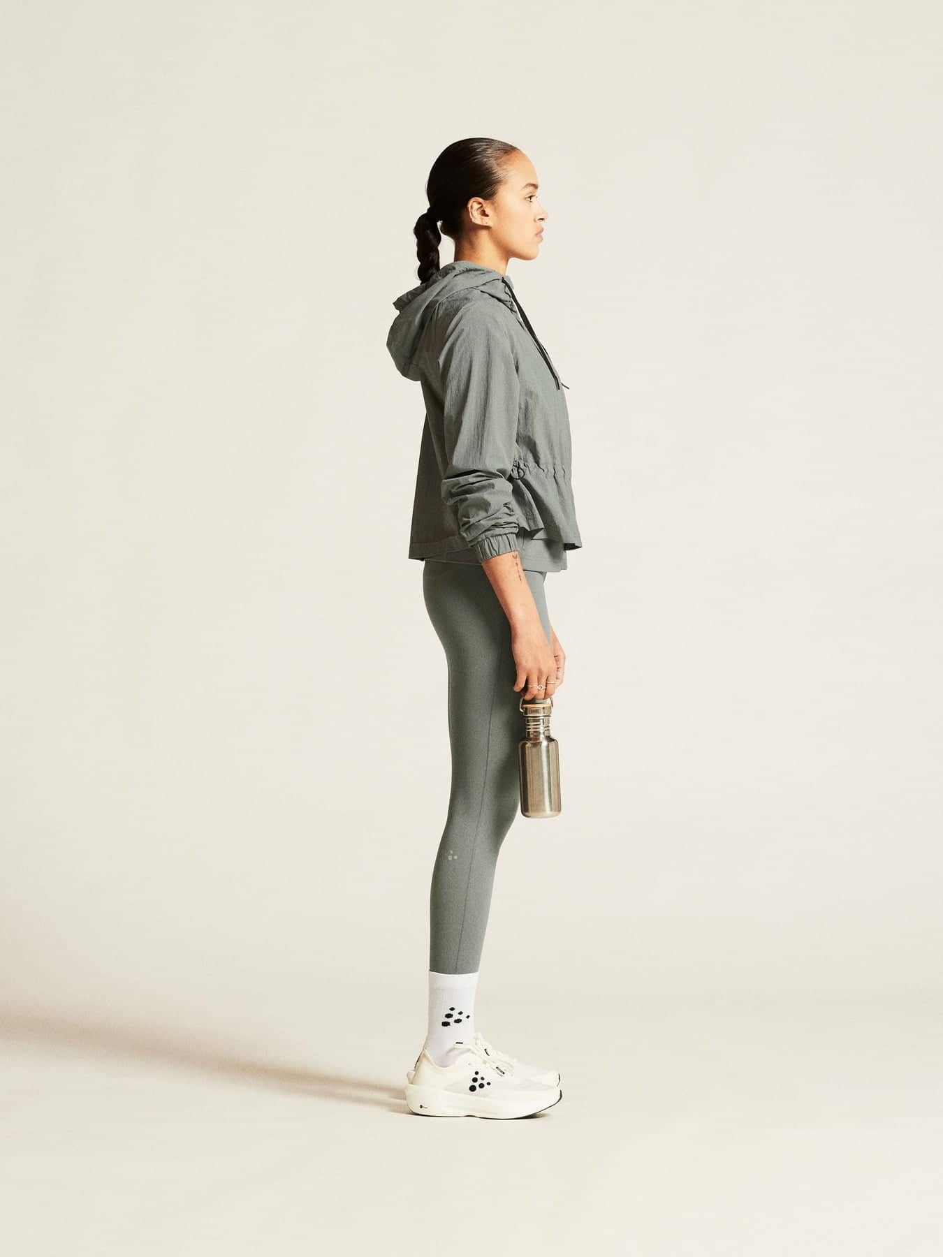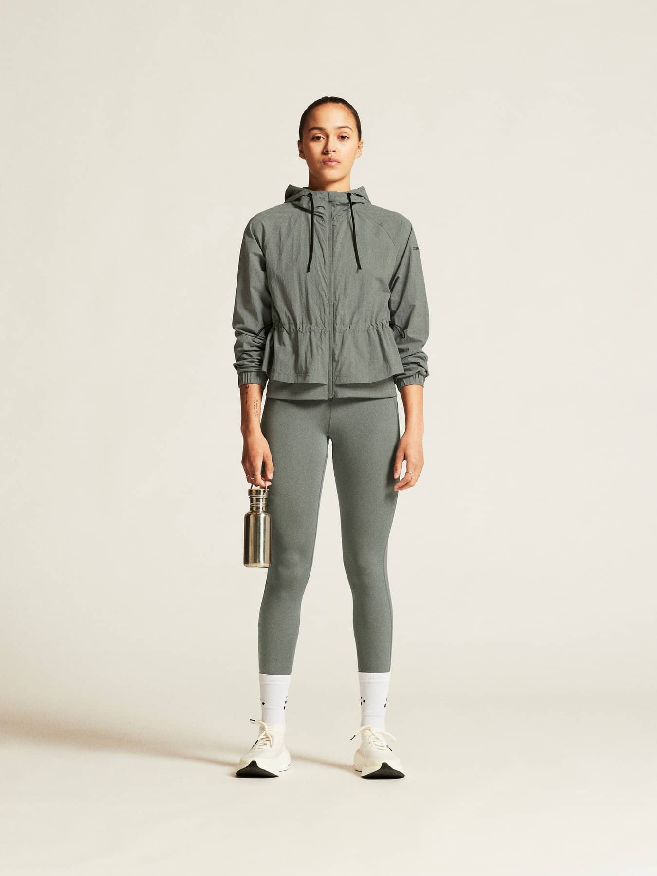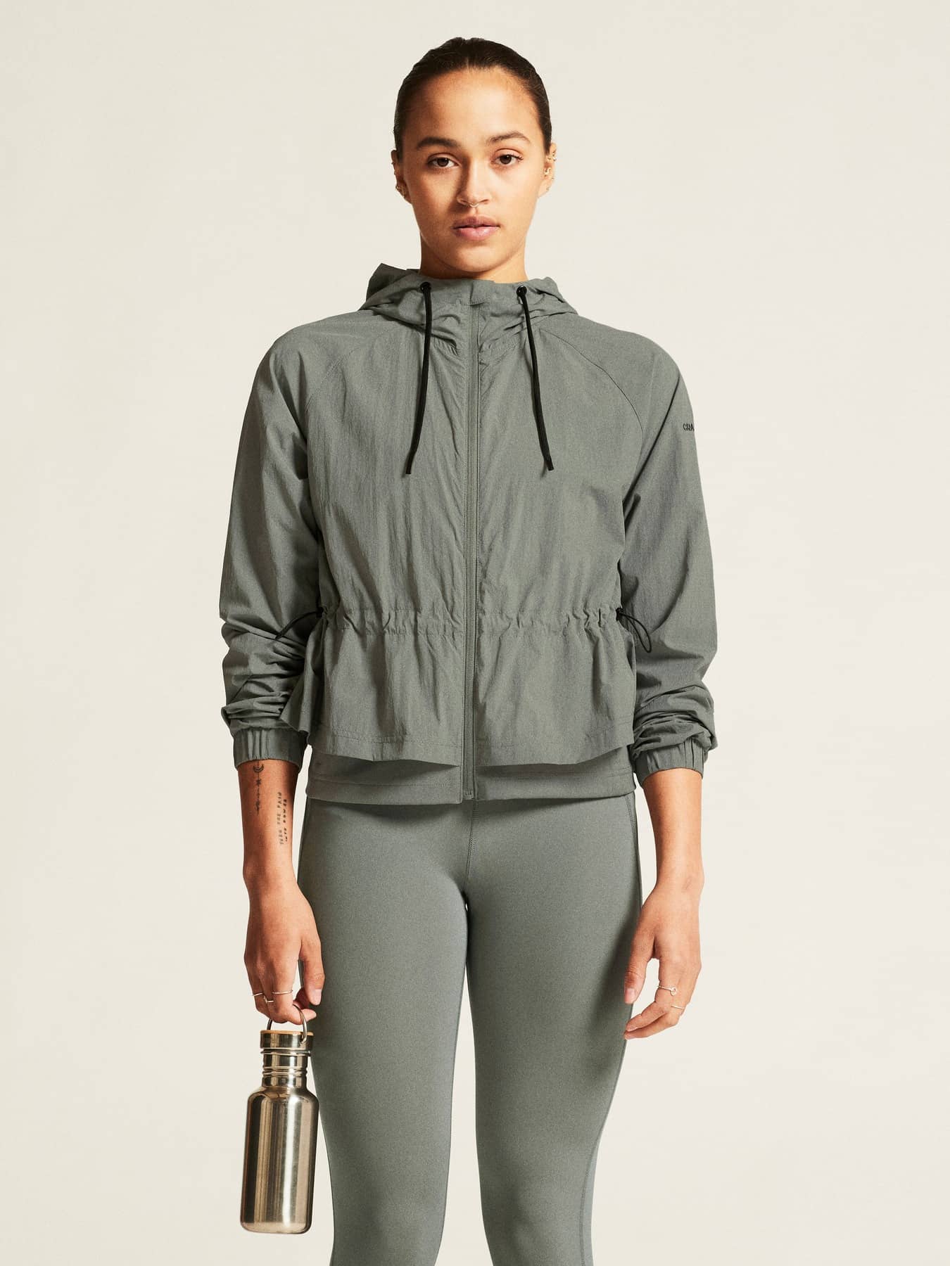 Diese moderne Windjacke ist aus dünnem und leichtem Stoff gefertigt und verfügt über ein funktionelles Netzfutter, das einen hervorragenden Feuchtigkeitstransport für optimalen Tragekomfort bietet. Eine weite Form kombiniert mit einem Gummizug in der Taille und einem eng anliegenden Jersey-Mieder im unteren Bereich sorgt für eine umwerfend feminine Silhouette. Außerdem verfügt die Windjacke über eine Kapuze mit verstellbarer Kordel und zwei verdeckte Reißverschlusstaschen zur sicheren Aufbewahrung von Schlüsseln und anderen Utensilien.
