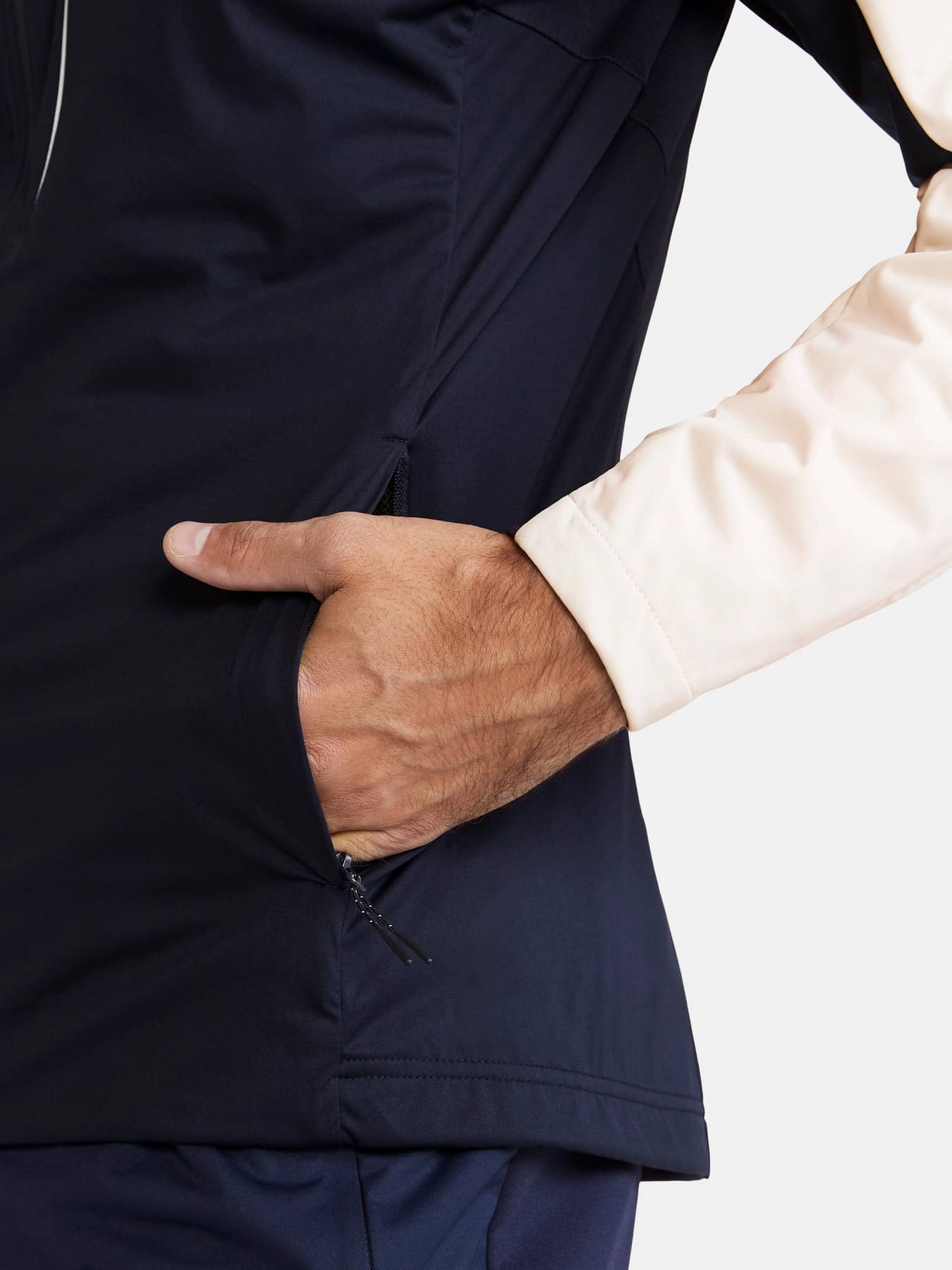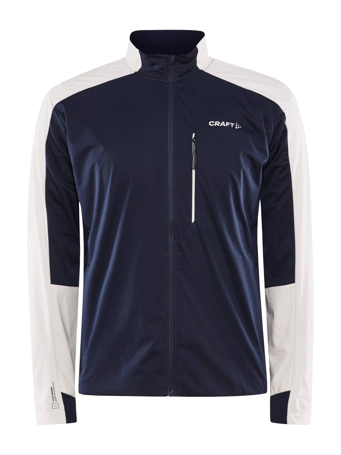 Nordische Skijacke mit leichter Wattierung auf der Vorderseite. Die Jacke kommt mit wind- und wasserdichtem Material auf der Vorderseite und gebürstetem Jersey auf der Rückseite und unter den Ärmeln für effizientes Körpertemperaturmanagement.