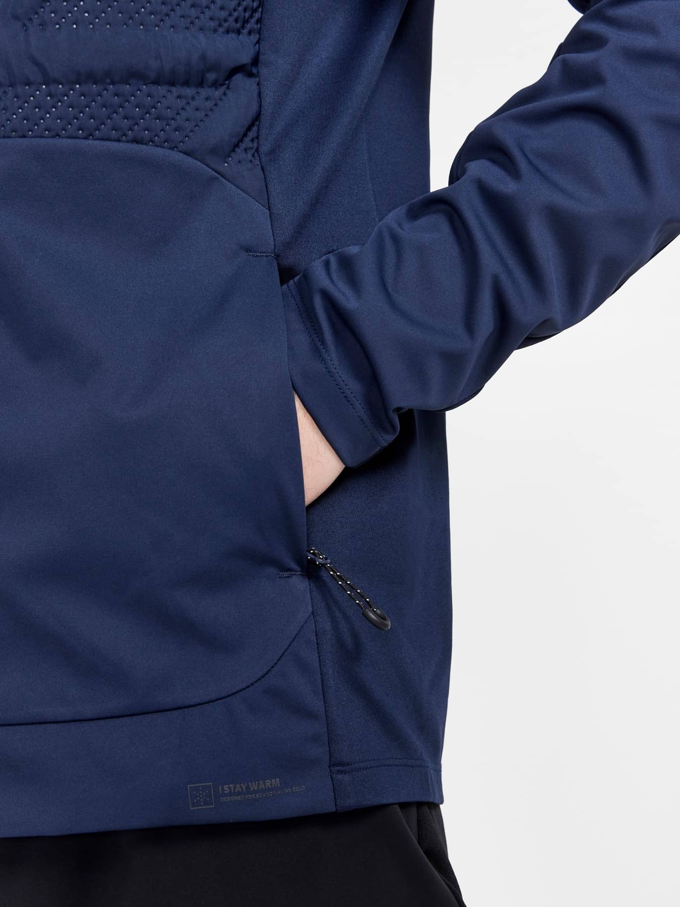 Nordische Skijacke mit leichter Wattierung auf der Vorderseite. Wind- und wasserdichtes Material auf der Vorderseite und gebürstetem Jerseygewebe auf der Rückseite und unter den Ärmeln. Vorne mit Grid-Fleece gefüttert, das für Isolierung und Feuchtigkeitstransport.