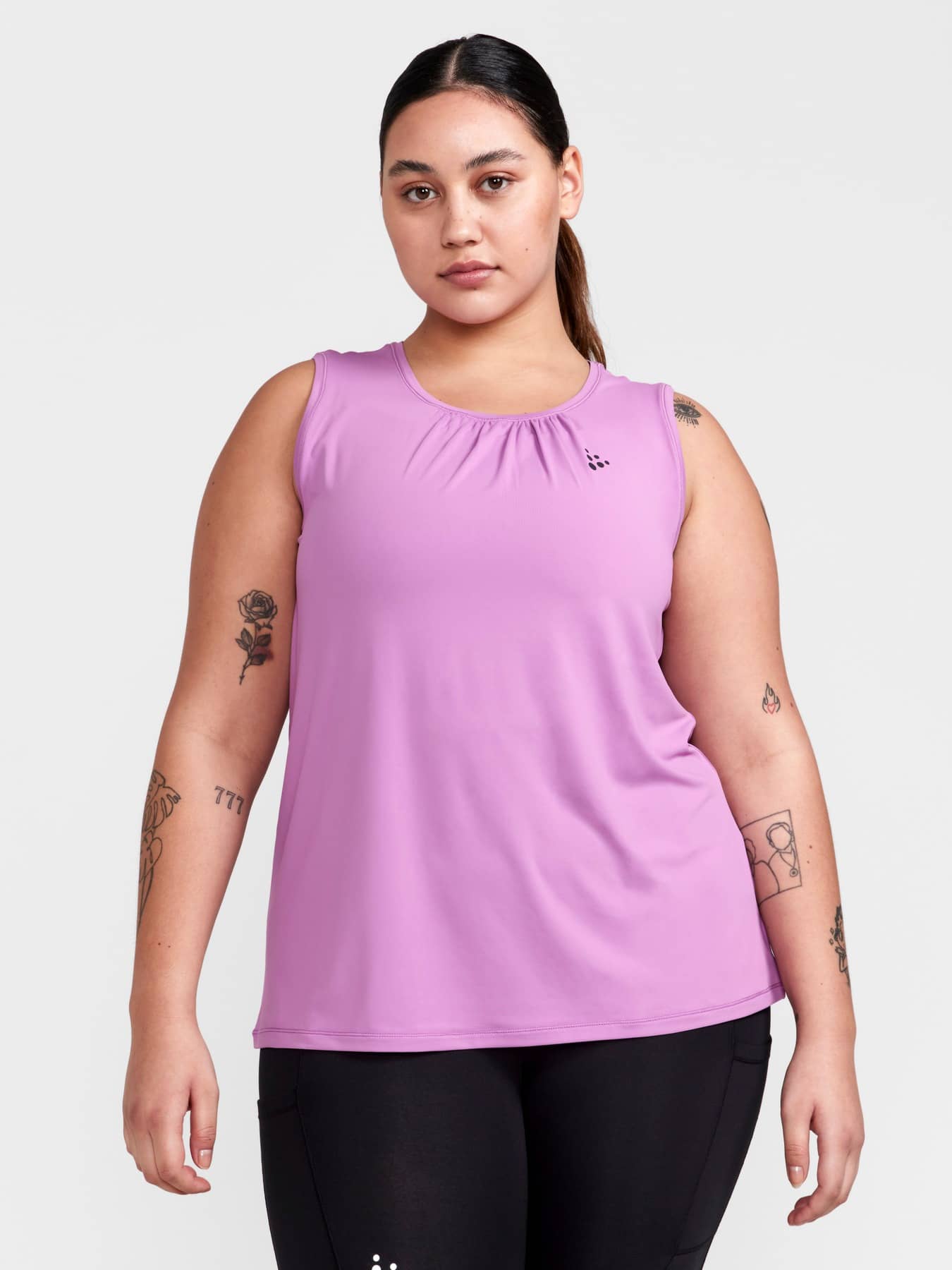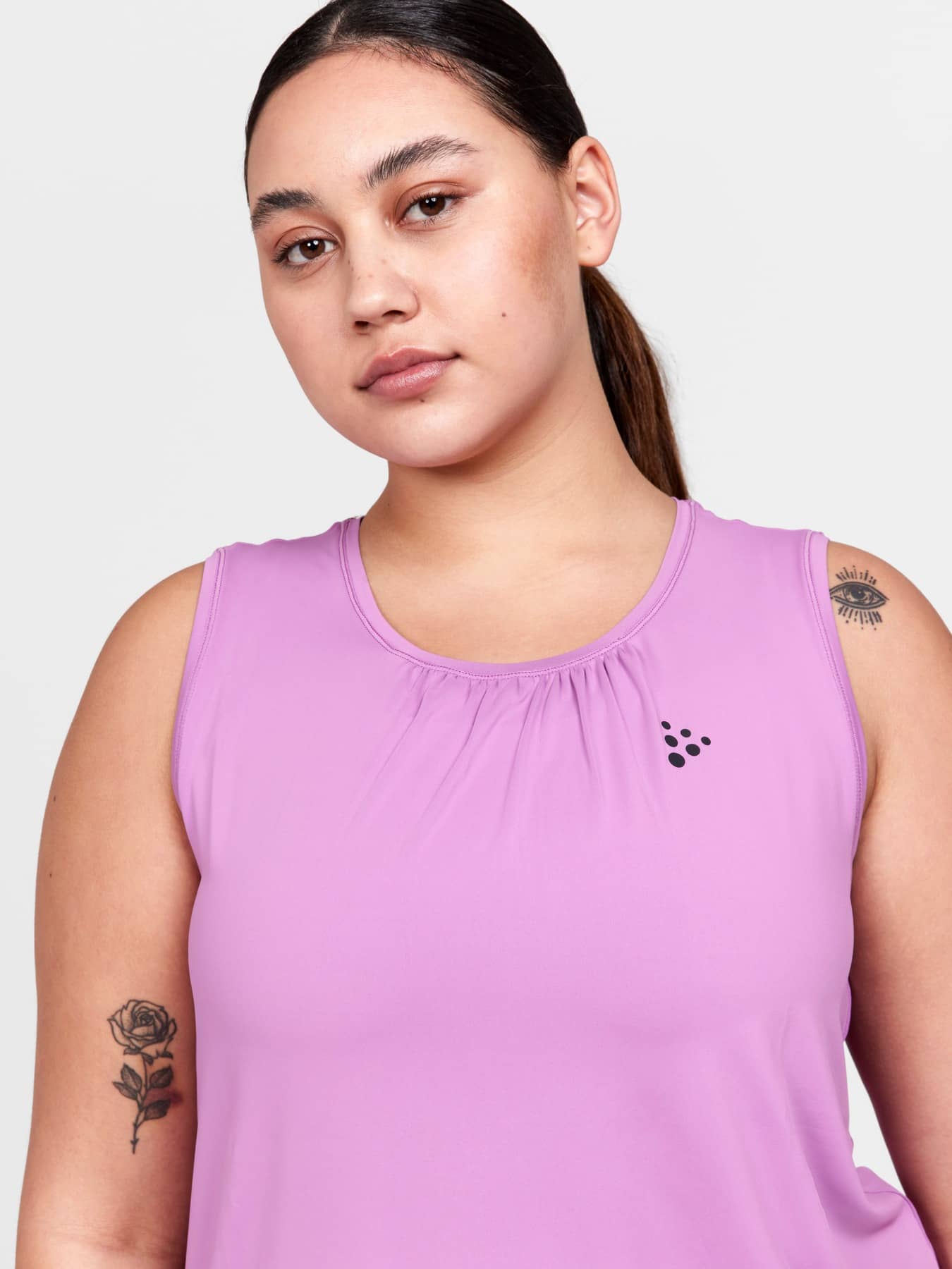 Training singlet with efficient moisture transport designed for all types of intense everyday workouts. Forgiving fit with gathering around neck hole. Made of soft and comfortable recycled jersey fabric.