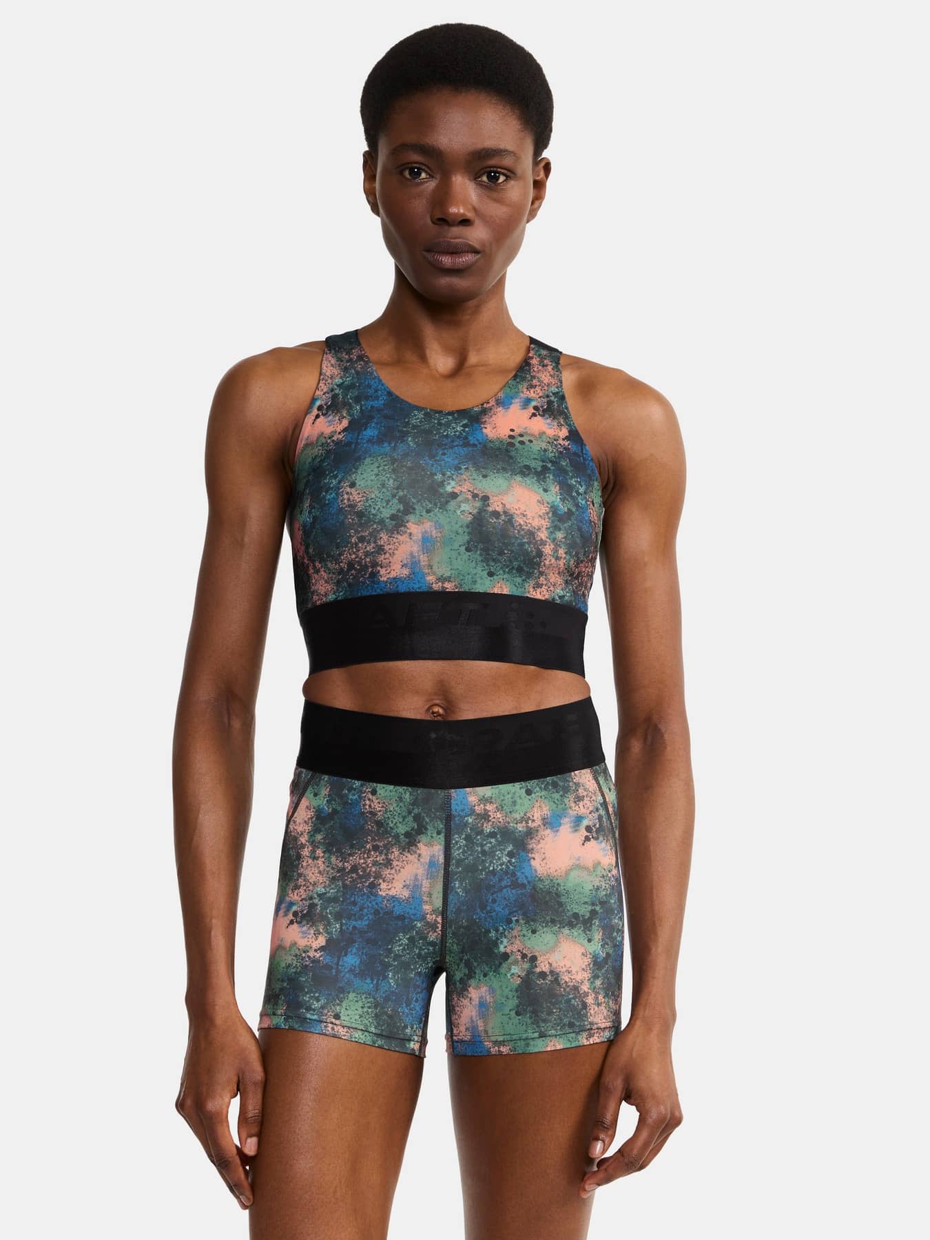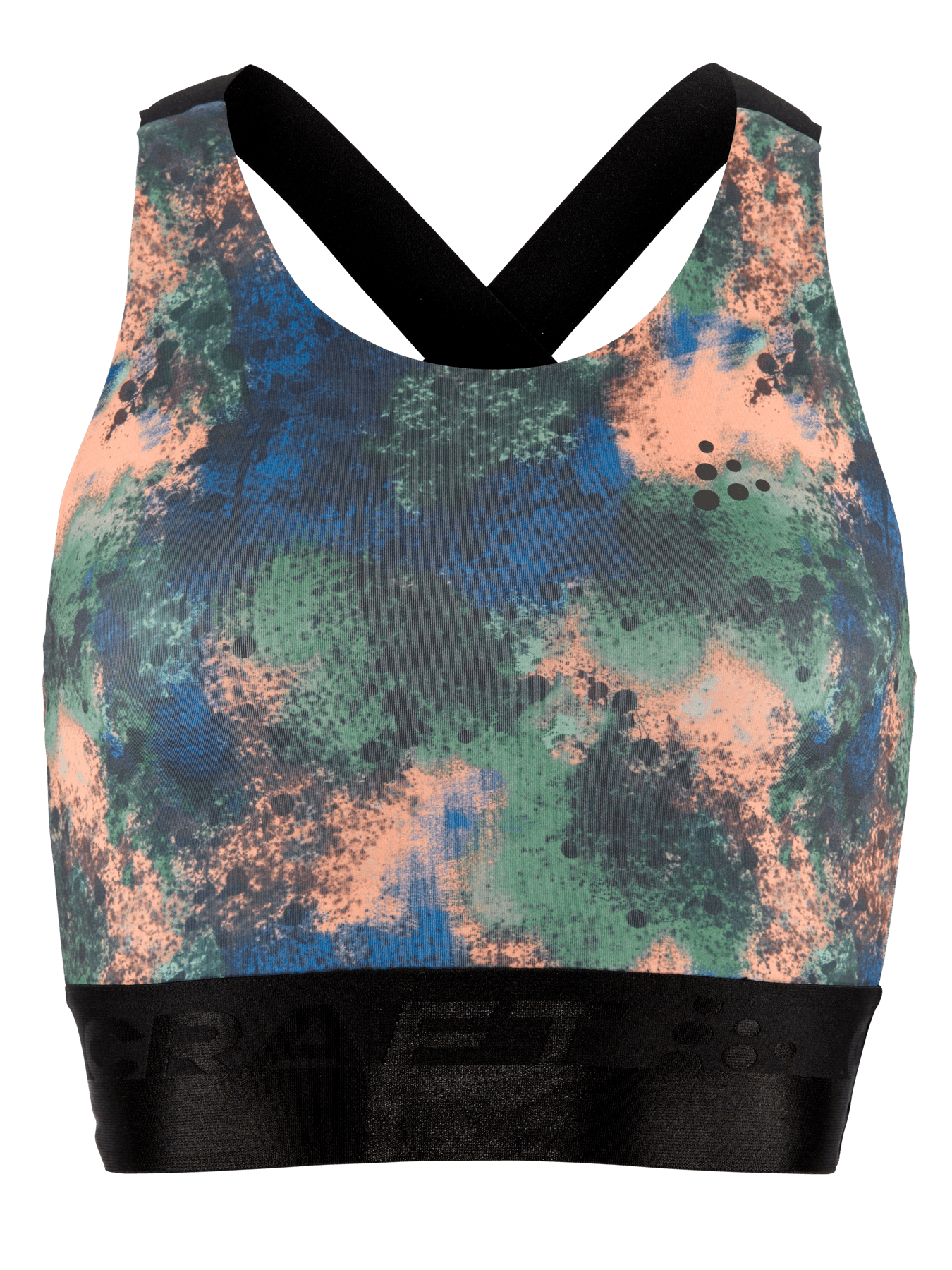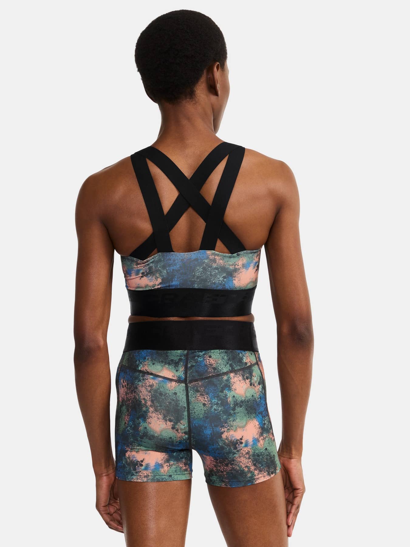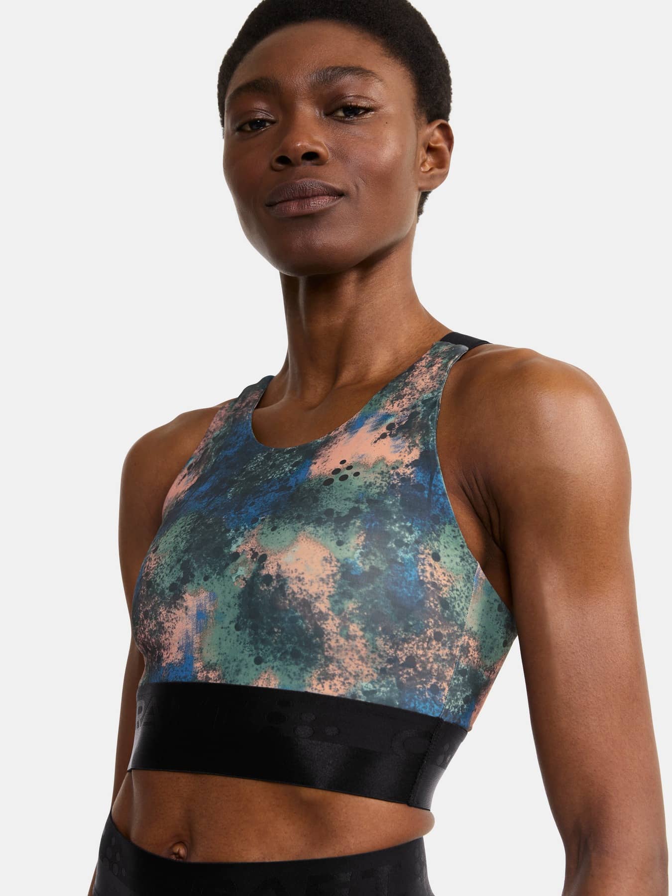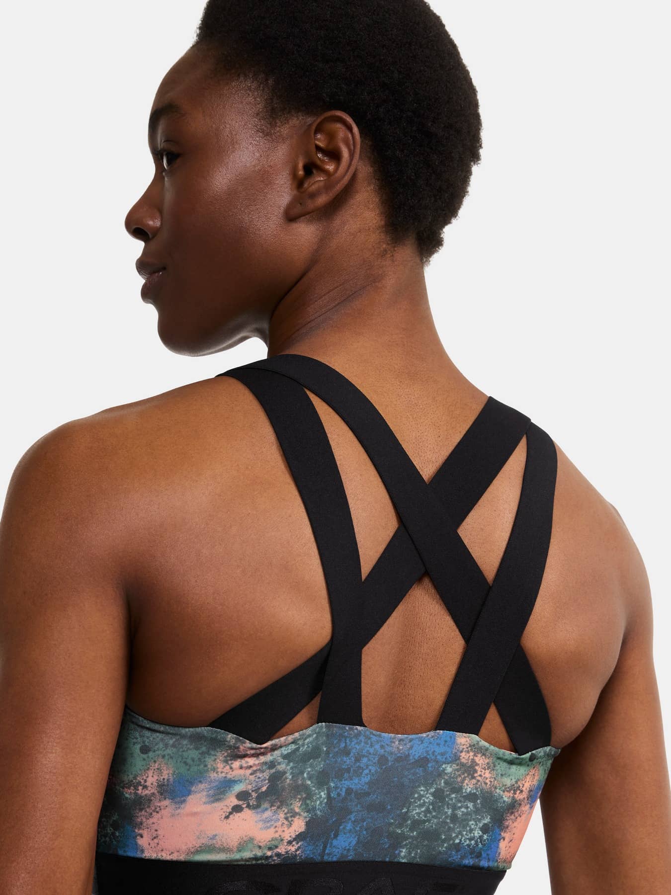 Sporttop mit leichter Unterstützung, das für die meisten Trainingsarten geeignet ist. Hergestellt aus weichem und funktionellem Jersey aus recyceltem Polyester und Elastan. Elastisch im unteren Bereich, gekreuzte Träger im Rücken und gefütterte Vorderseite, um Durchsichtigkeit zu vermeiden.