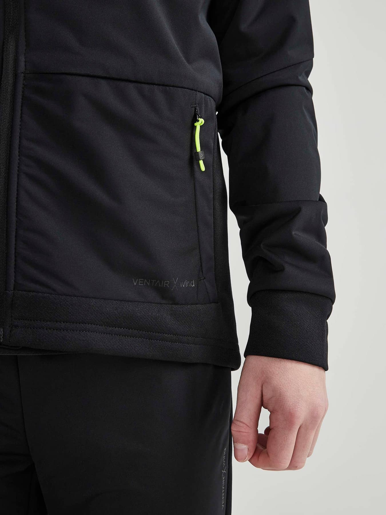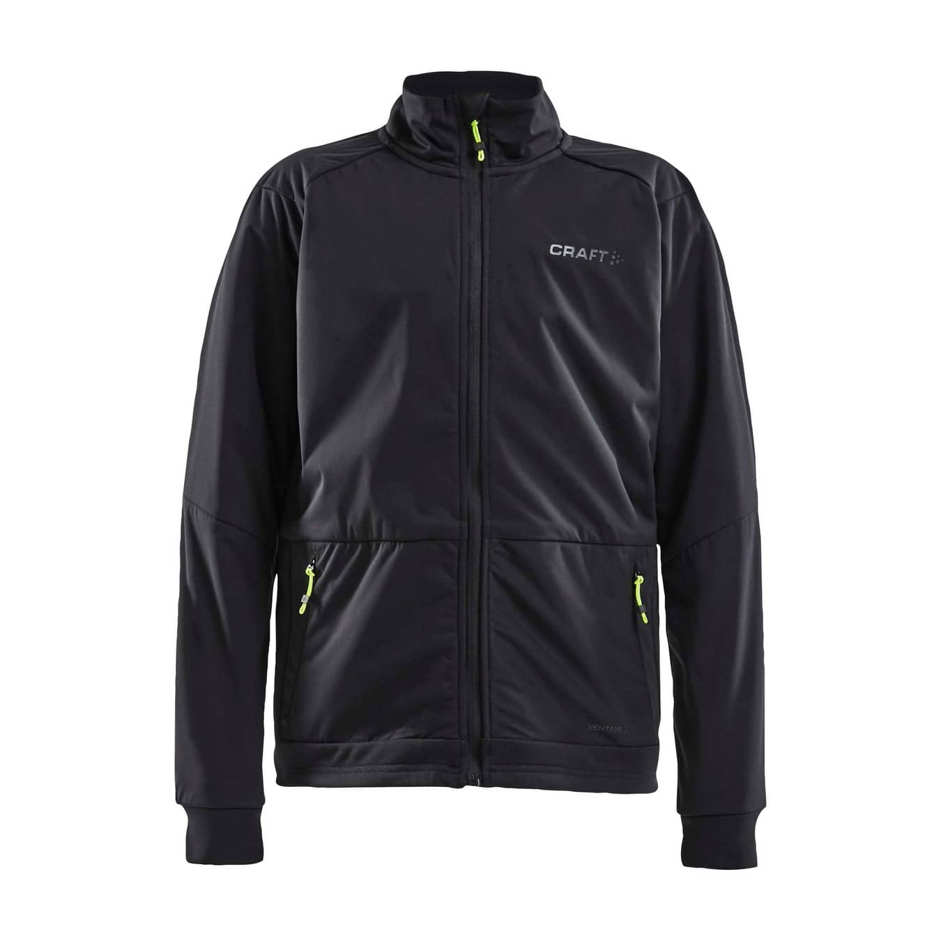 Jacke mit wind- und wasserdichter Vorderseite aus 2-Lagen-Ventair Material. Ärmelunterseite, Seiteneinsätze und Rückenteil aus gebürstetem Jersey für optimalen Feuchtigkeitstransport und hohen Tragekomfort. Zwei Seitentaschen vorne mit Reißverschluss.