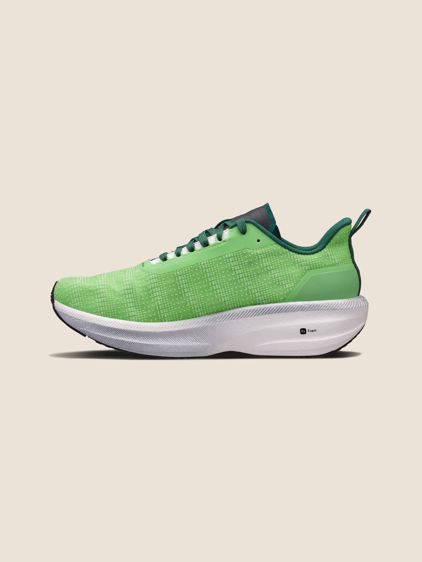 Px Foam™ ist ein ultraleichtes Zwischensohlenmaterial, das sich durch Energierückgabe, Stoßdämpfung und Flexibilität auszeichnet. Dieses innovative Material wird aus einem einzigen natürlichen Schaumbildner hergestellt und kommt ohne chemische Vernetzungsmittel aus, wodurch ein ungiftiger Herstellungsprozess gewährleistet ist. Darüber hinaus sind die Roh- und Fertigmaterialien vollständig wiederverwendbar. Der Hochleistungsschaumstoff hat eine extrem niedrige Dichte und ist damit bis zu 20 % leichter als herkömmliches EVA. Das reduzierte Gewicht in Kombination mit explosivem Rebound machen Px Foam™ perfekt für jeden Lauf.