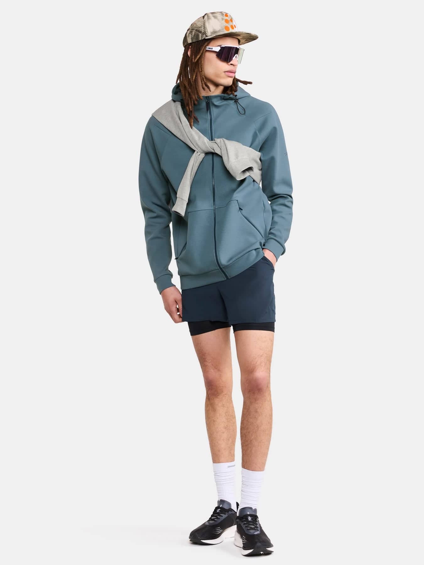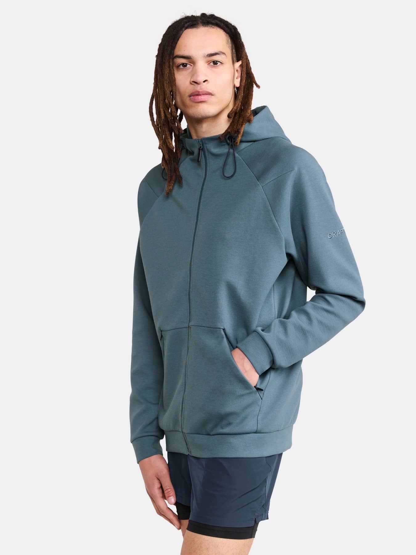 Denna stilrena huvjacka är gjord av ett premiumtyg med slät bomullsutsida och insida av mjuk polyester. Resultatet är ett plagg med hög komfort som passar perfekt på vägen till och från gymmet men även till avslappnade stunder i vardagen. Hoodien har hellång dragkedja framtill, justerbar huva, raglanärmar och känguruficka med dragkedjor. En minimalistisk design gör att huvjackan enkelt kan matchas med en mängd olika vardags- och träningsplagg. Broderad logo på vänster ärm förstärker plaggets premiumkänsla.