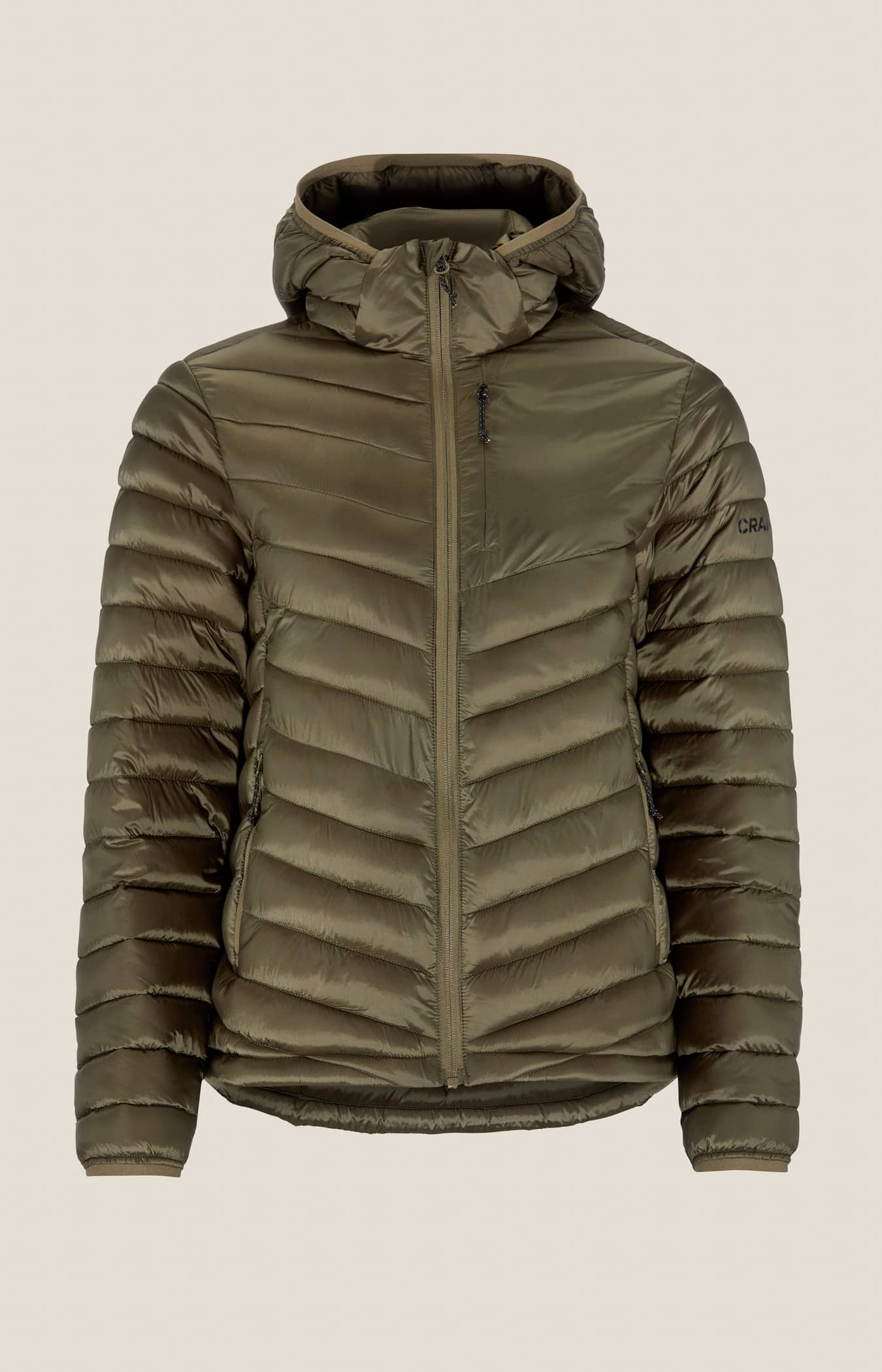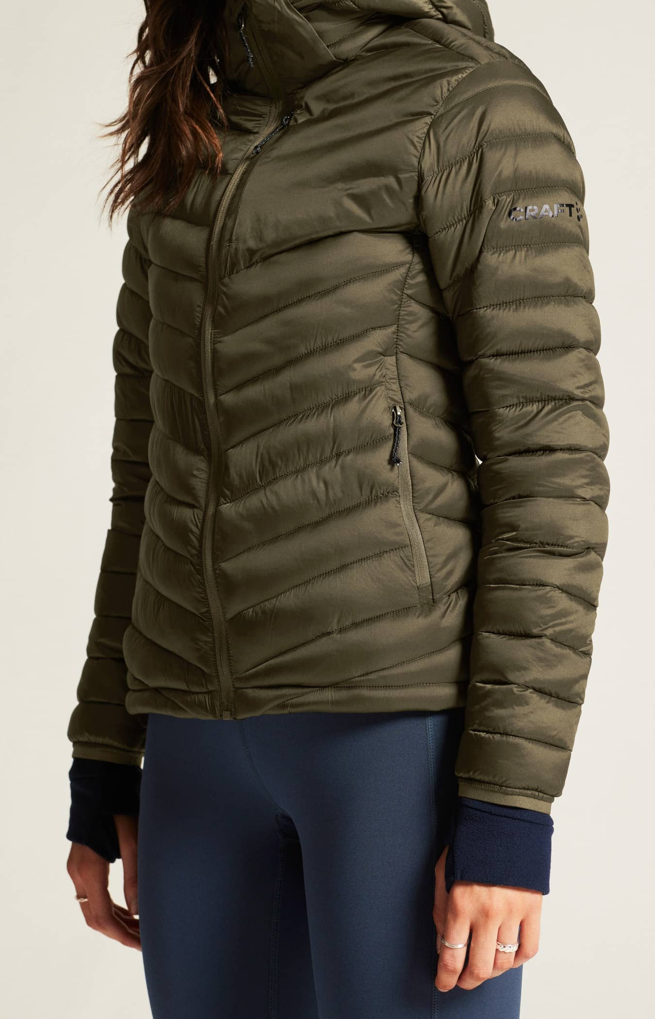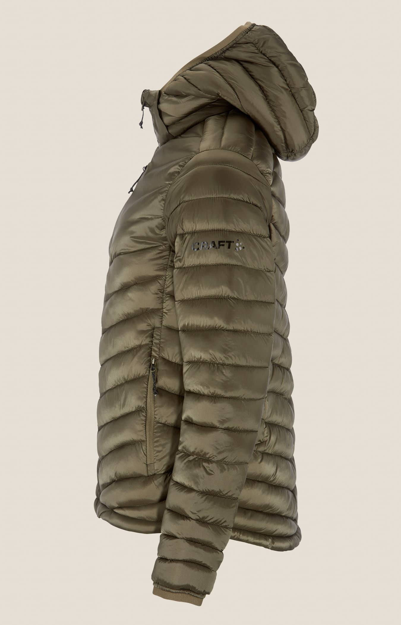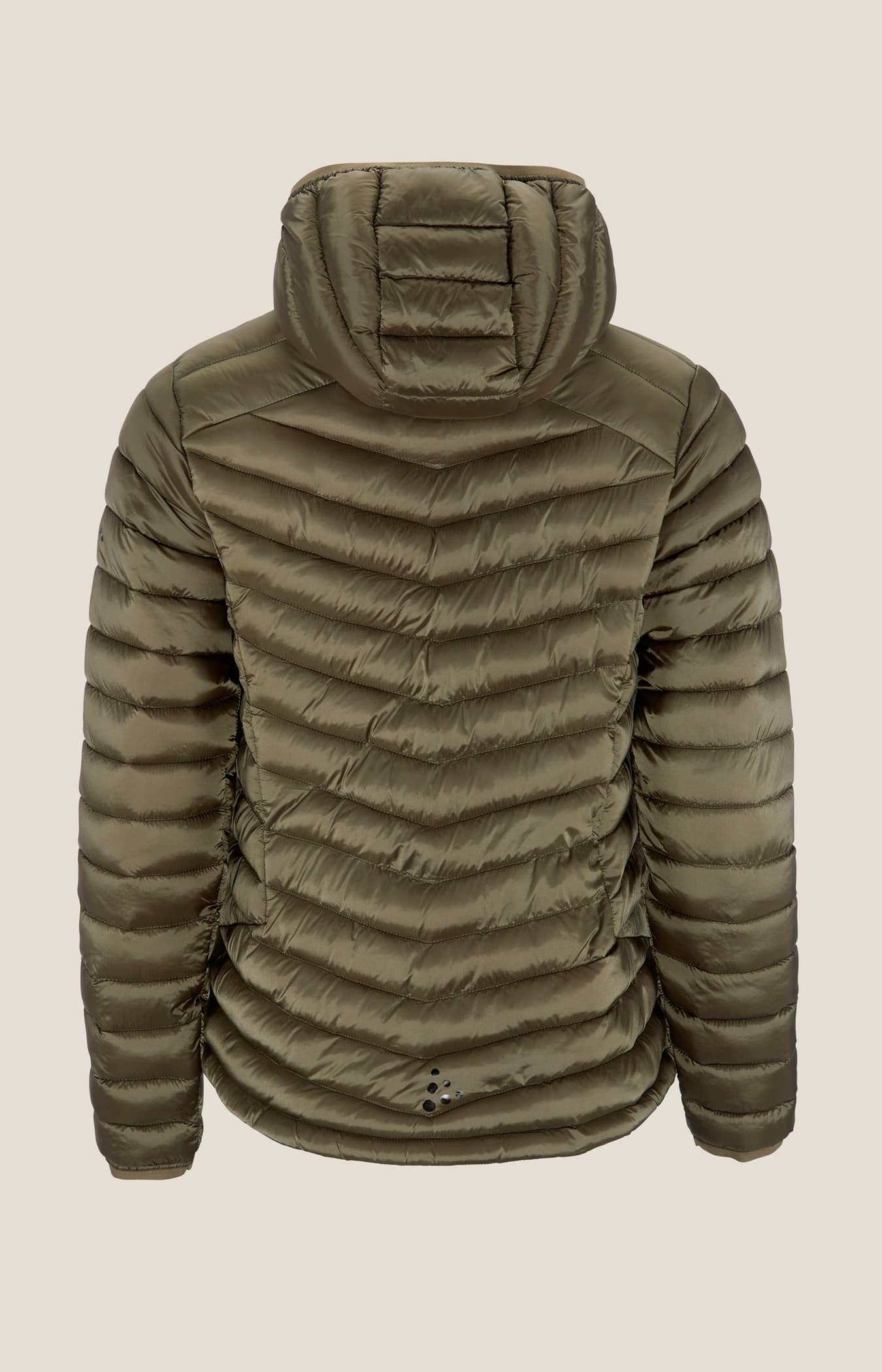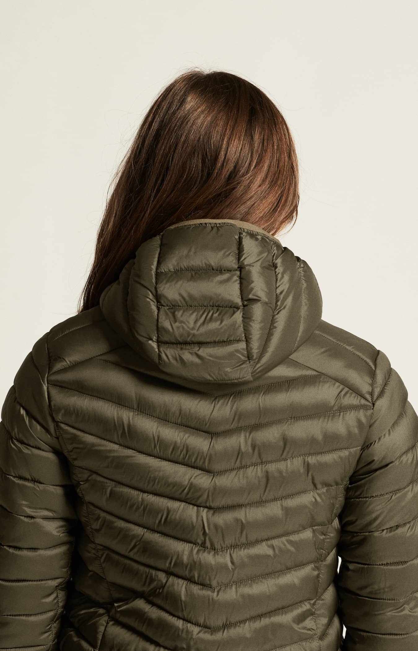 • Kviltad design i kropp, ärmar och huva
