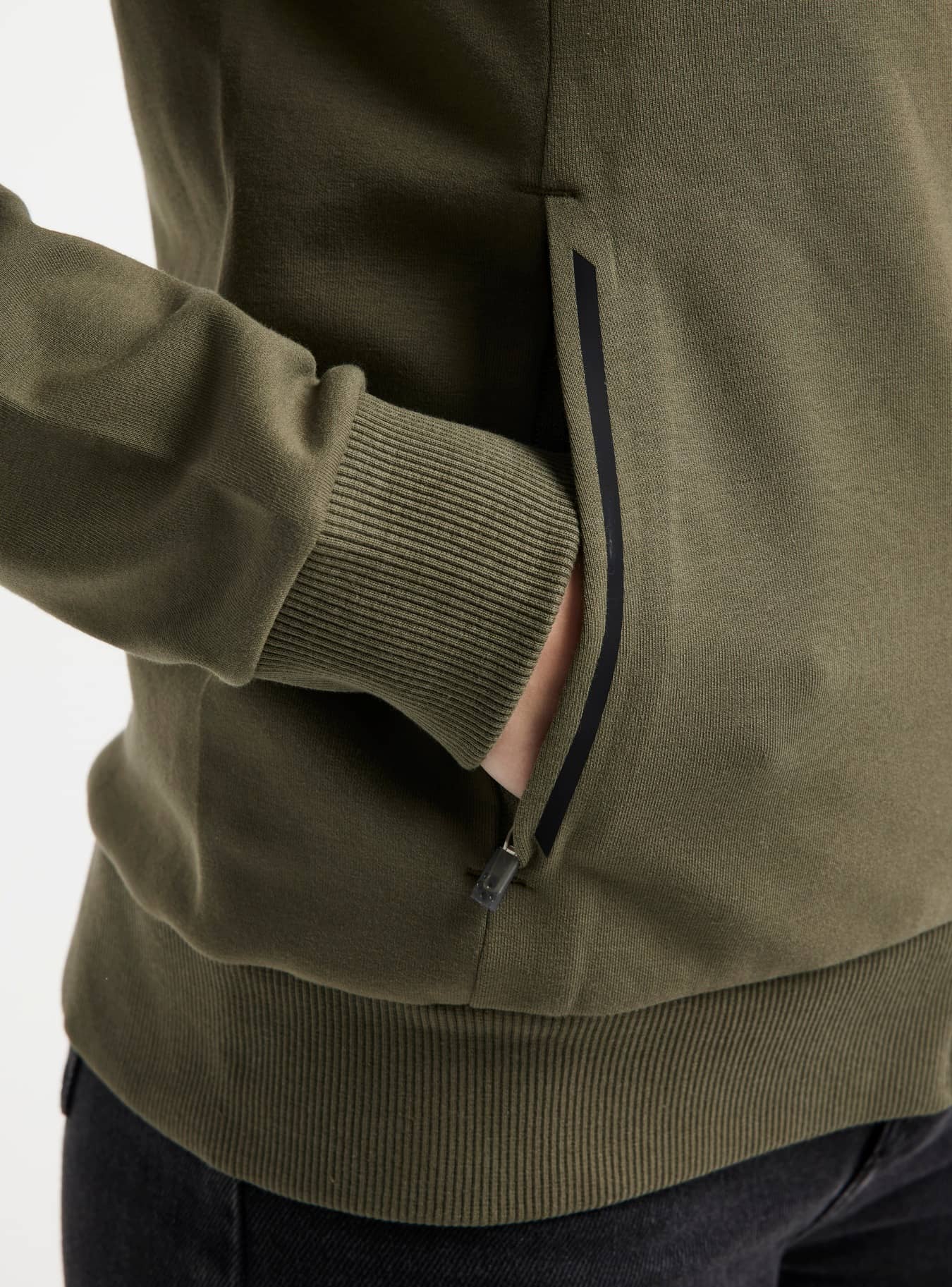 Stilren huvjacka för vardagsbruk gjord i ett mjukt och funktionellt material av bomull och polyester. Plagget har två fickor med dragkedja, logo på bröst och rygg samt dragkedjor för ett modernt uttryck.