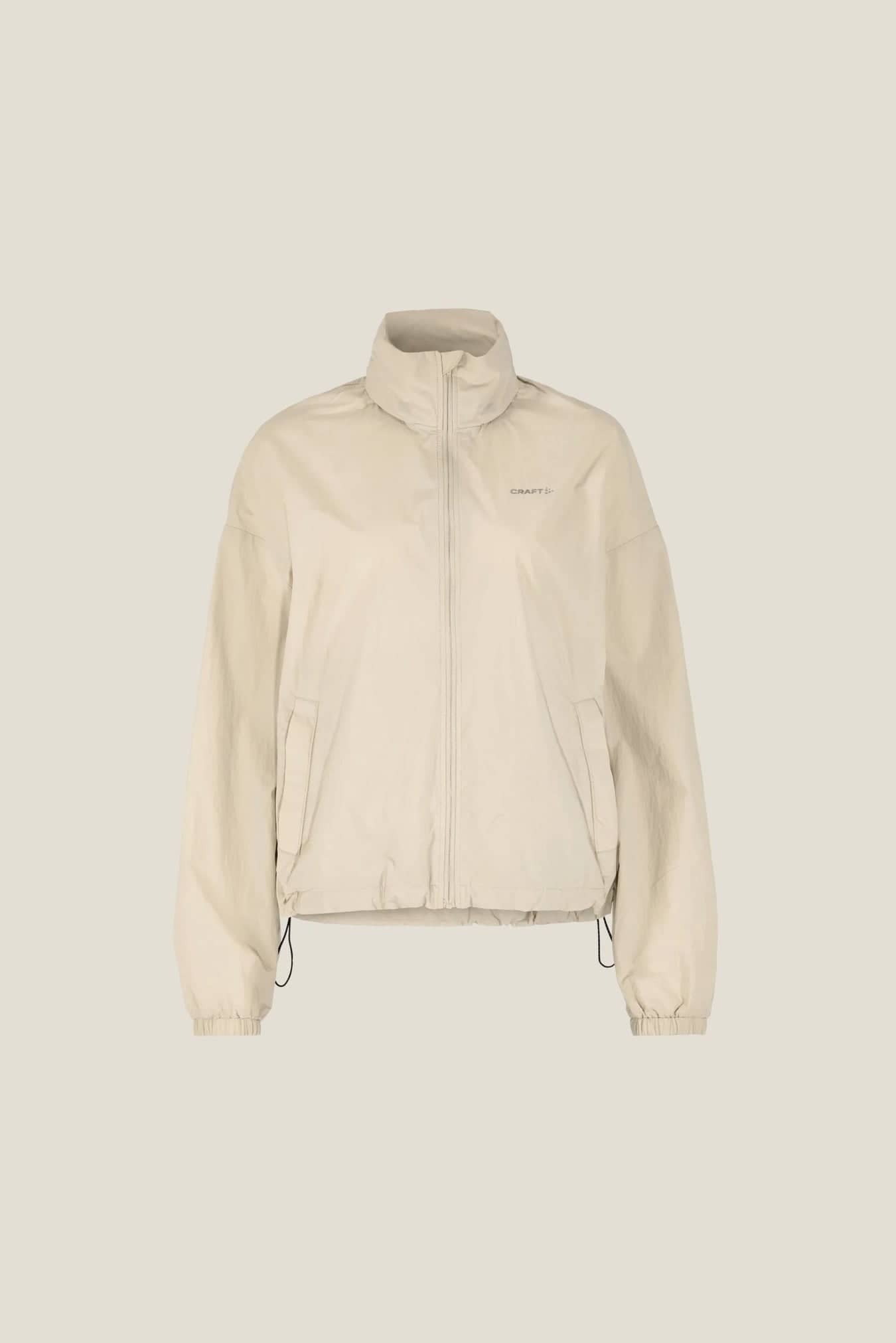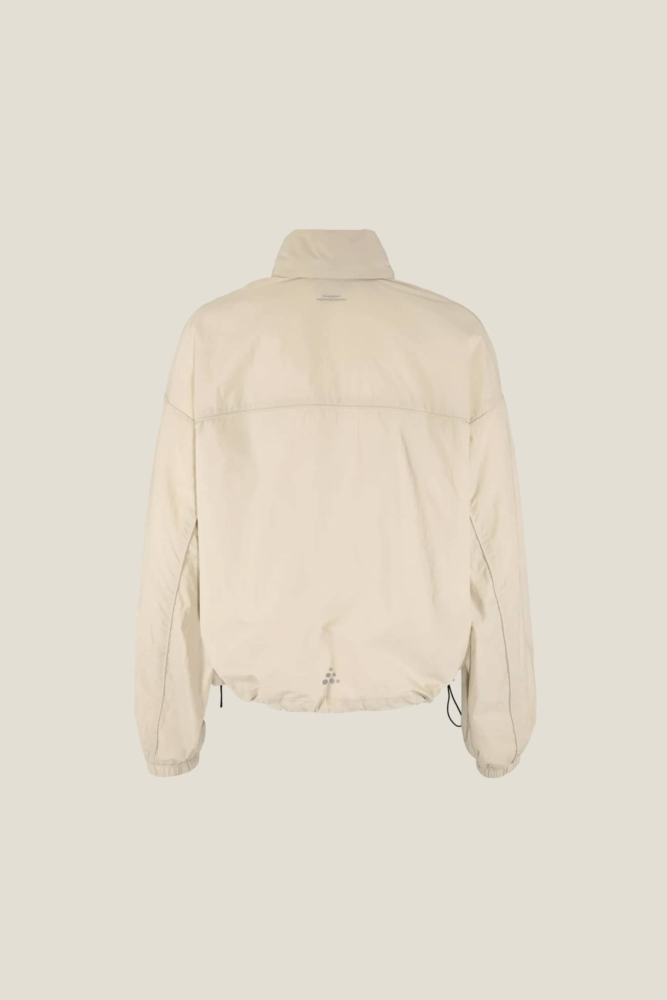 Jackan hämtar inspiration från klassiska löparplagg och är sydd i återvunnen polyamid som ger effektiv ventilation och fukttransport. Två sidfickor med dragkedja ger säker förvaring av exempelvis nycklar och energibars, medan två justerbara dragskor i nederkanten möjliggör en individuell passform. Jackan har även en praktisk huva som kan vikas in i kragen. För smidig anpassning till skiftande väderförhållanden kan den packas ner i vänsterfickan och förvandlas till en kompakt tygpåse som enkelt bärs runt midjan.