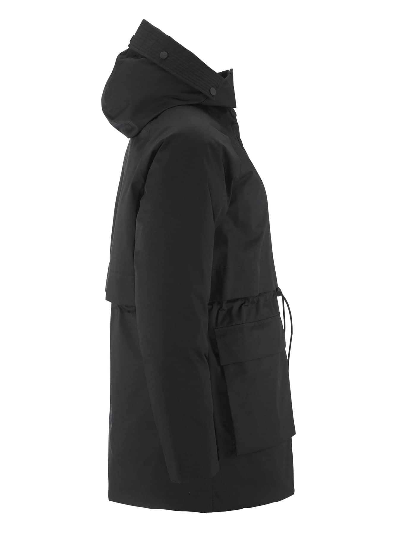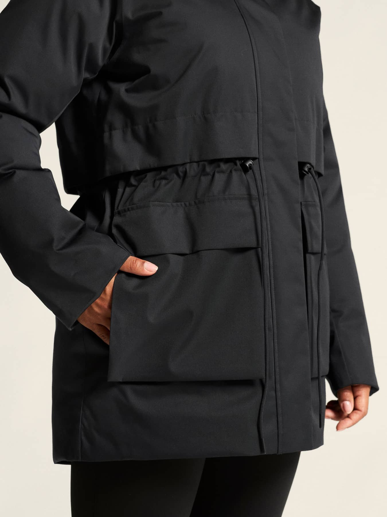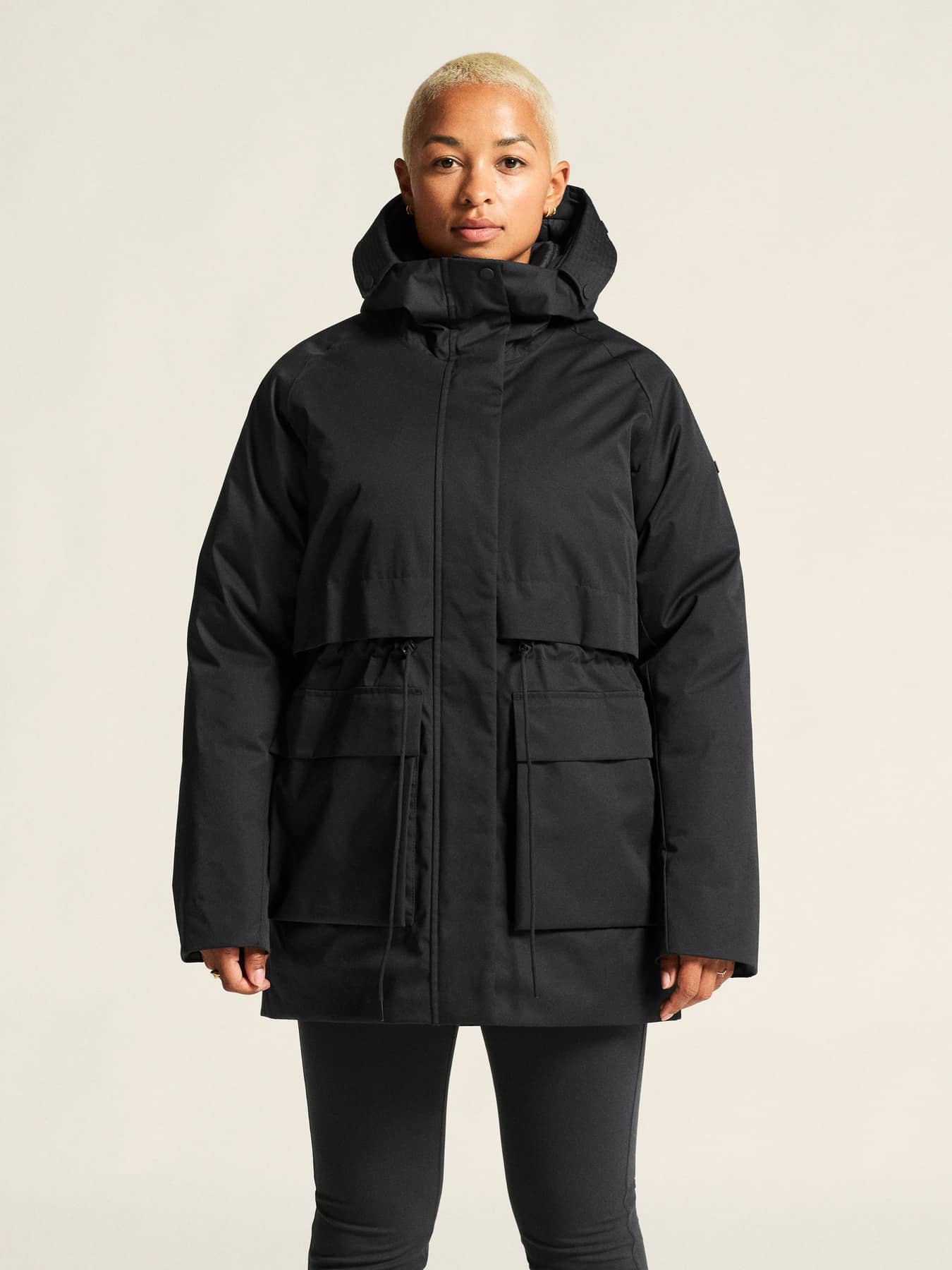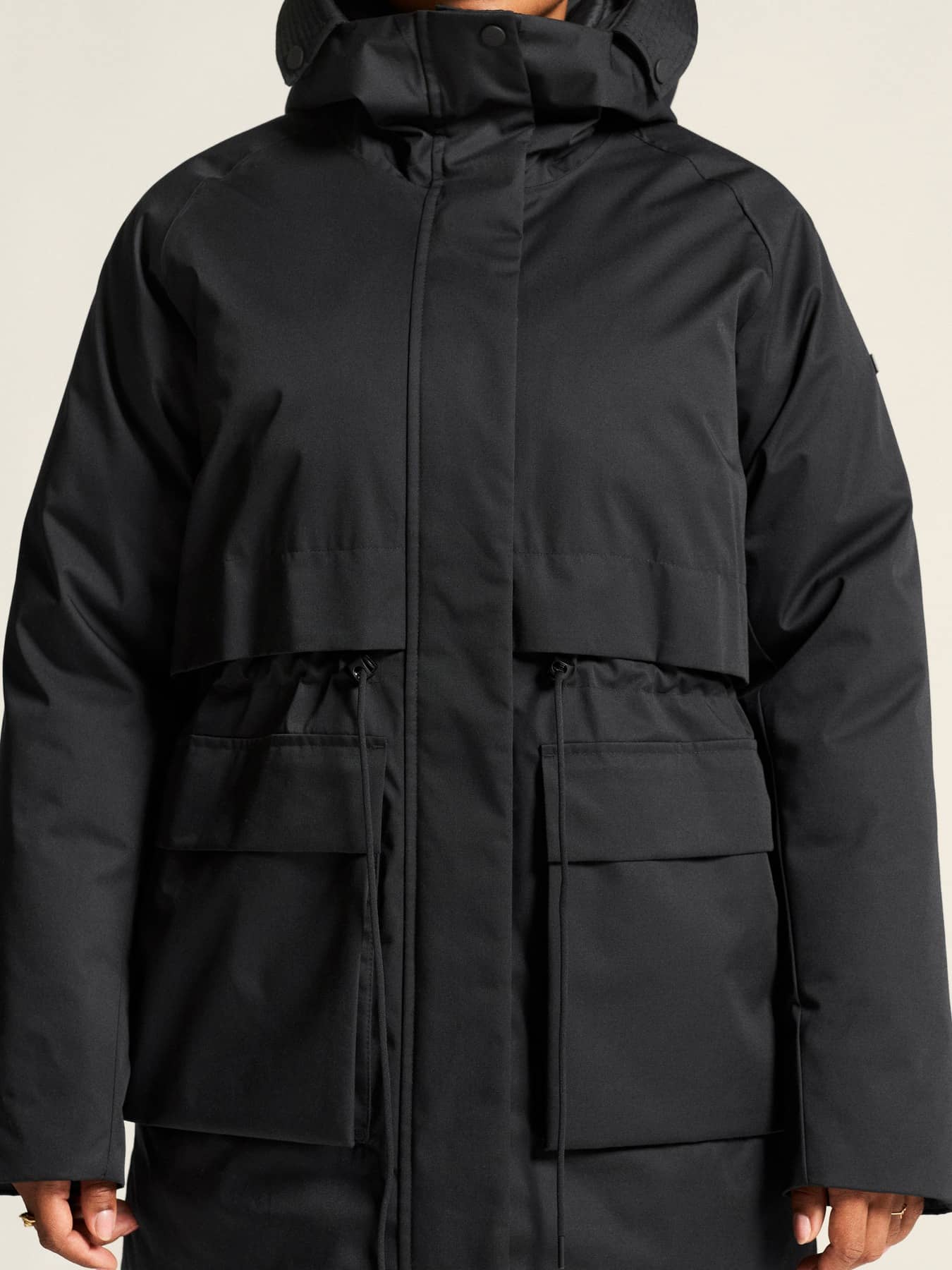 • Huva med justerbar dragsko för optimal passform